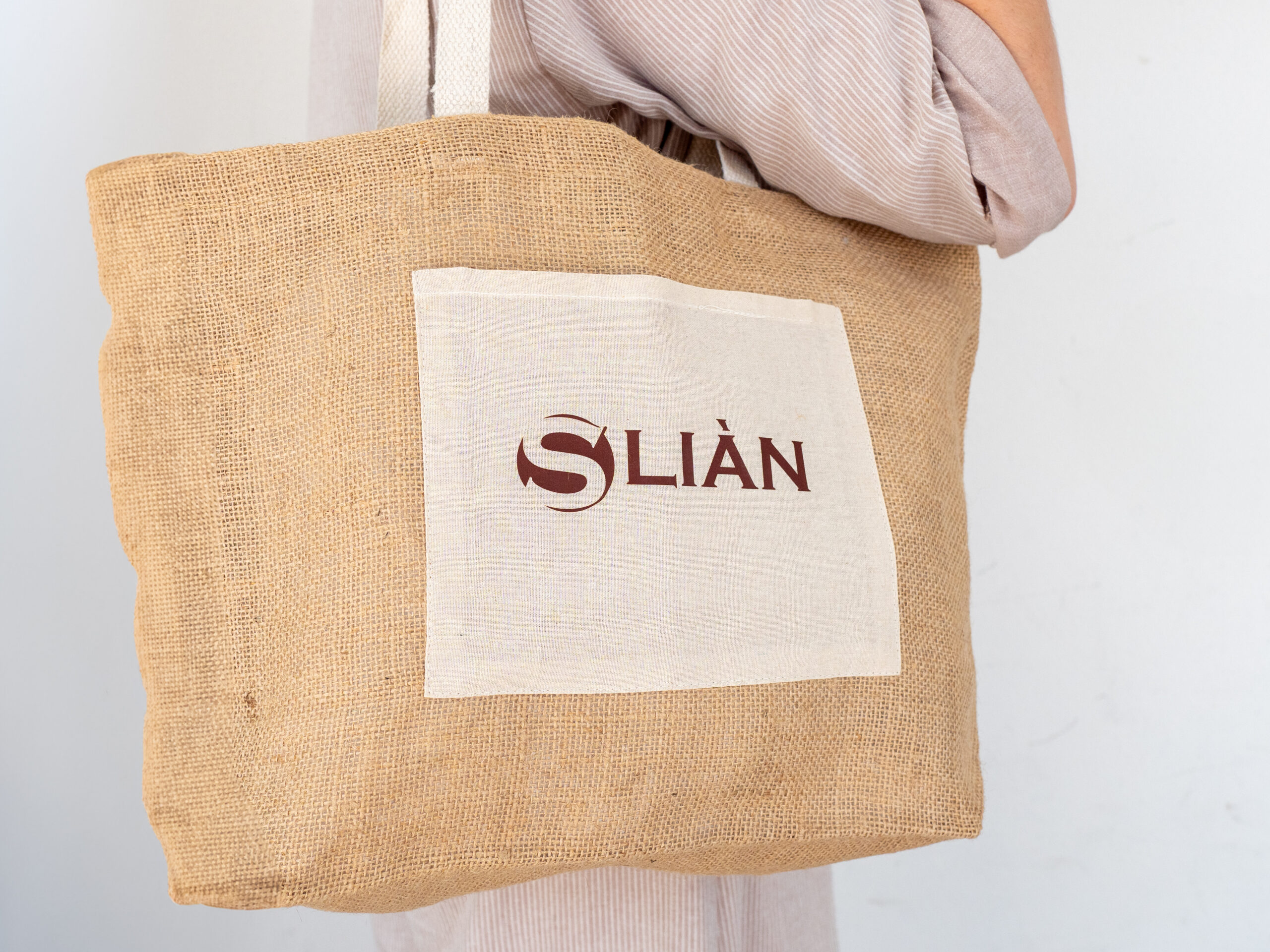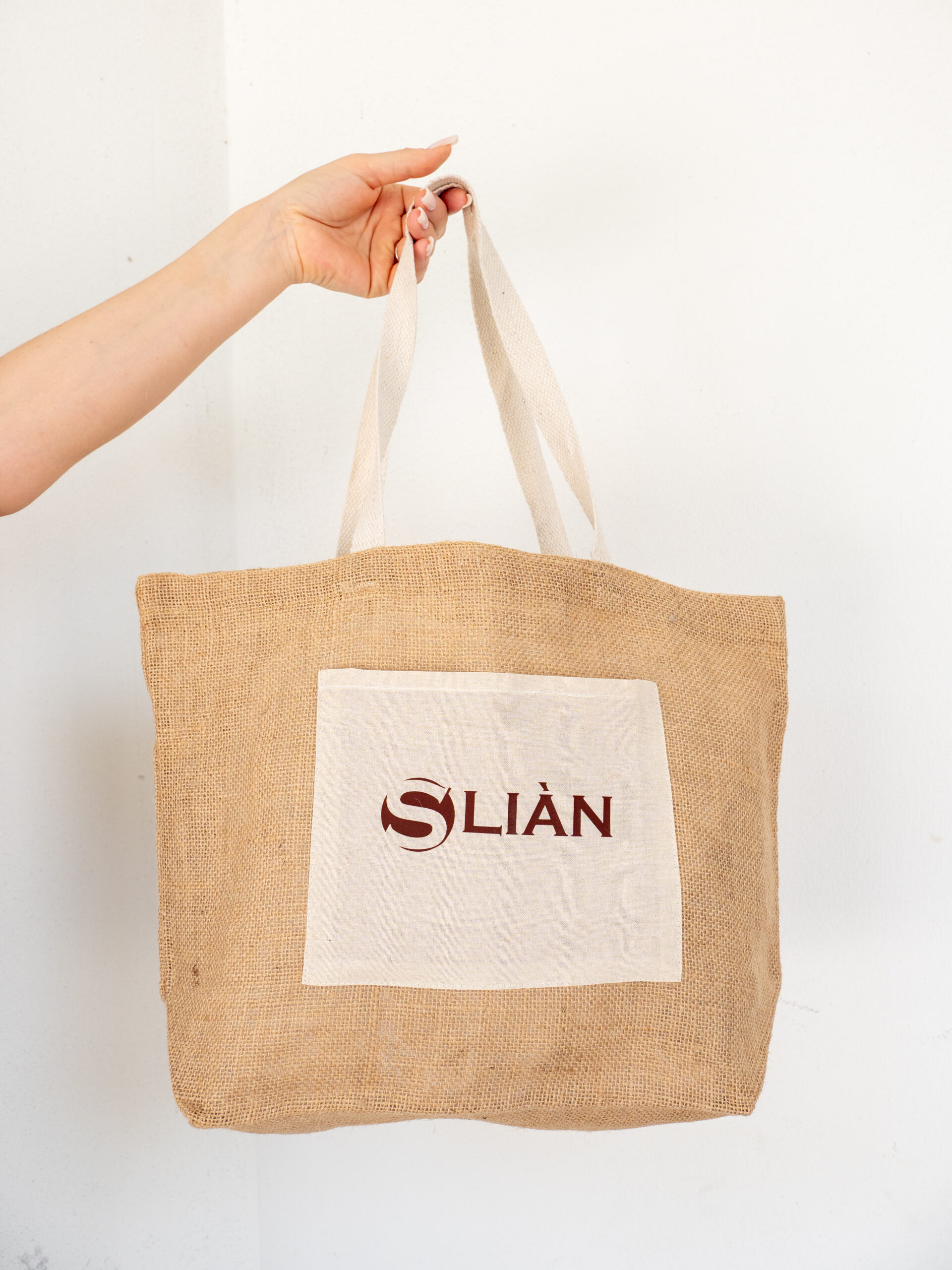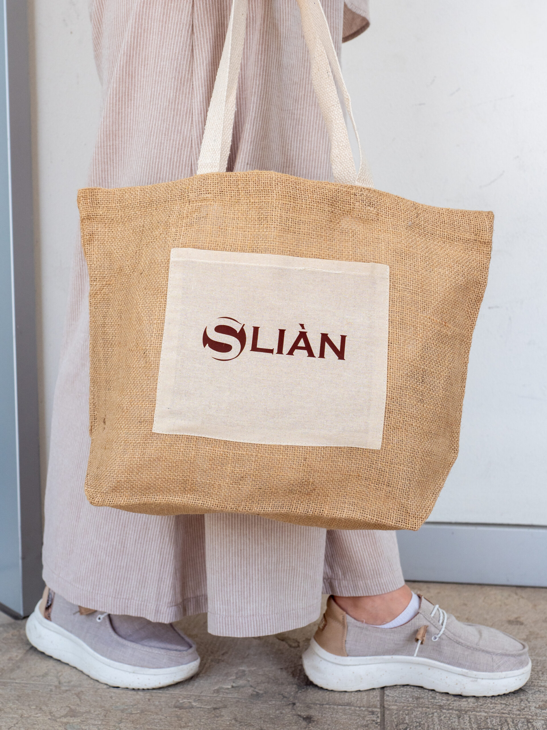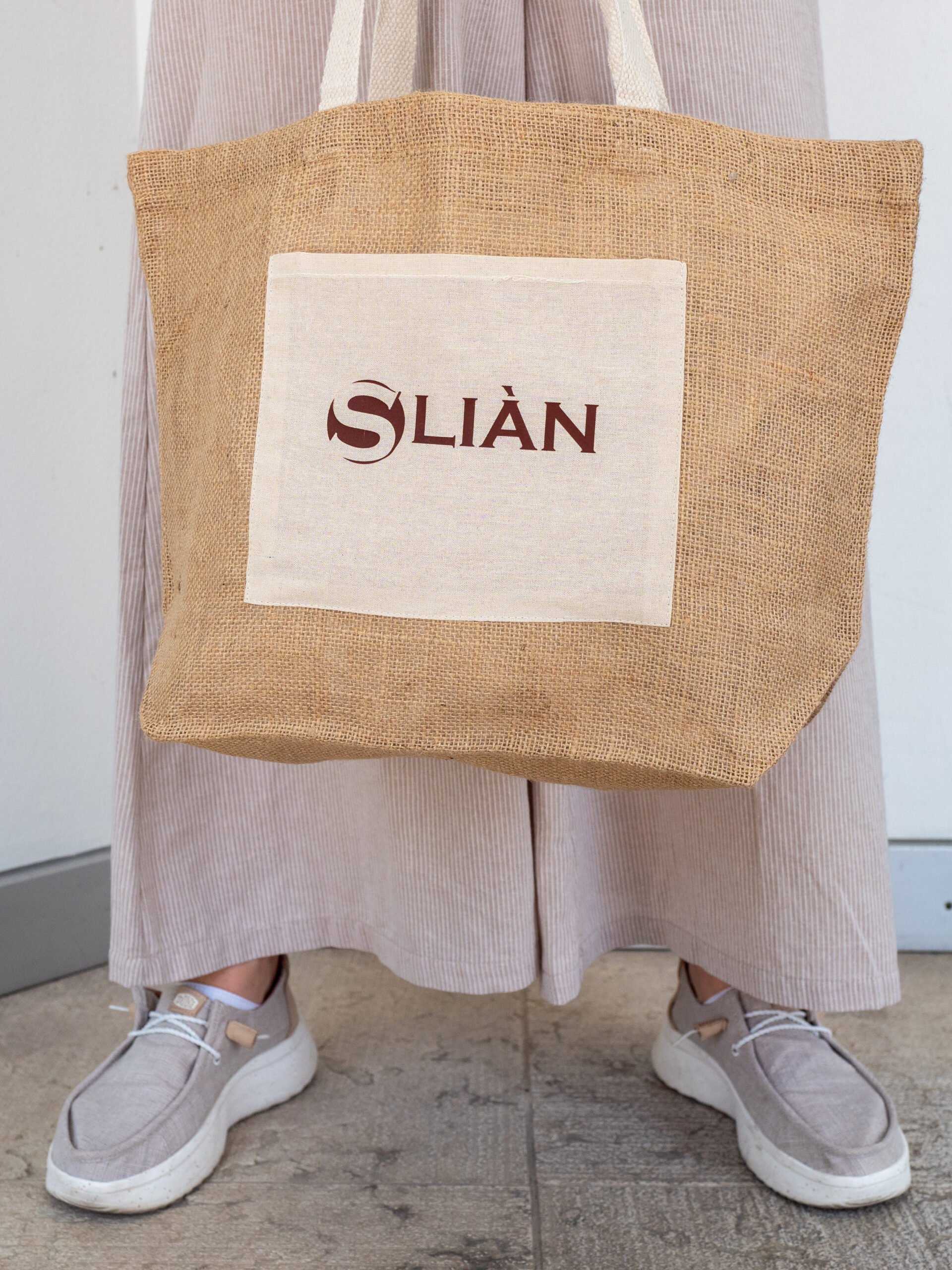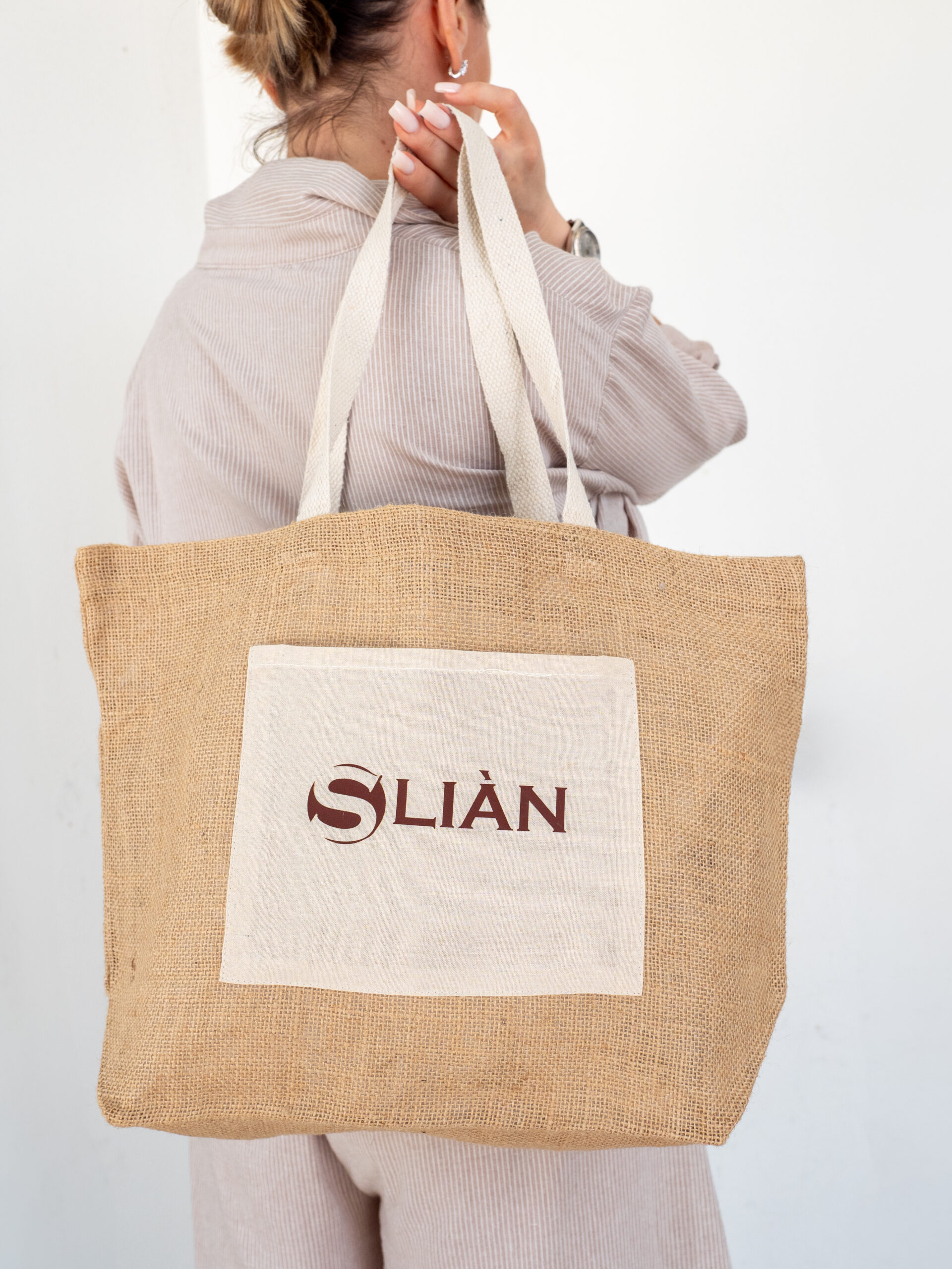 La borsa mare Sliàn è l’accessorio perfetto per accompagnarti con stile e praticità durante le giornate estive. Realizzata in juta naturale con ampi manici e tasca frontale in cotone riciclato, unisce estetica eco-friendly a funzionalità. Il suo design semplice ed elegante, impreziosito dal logo Sliàn stampato in marrone scuro sulla tasca, la rende facilmente abbinabile a qualsiasi outfit estivo, dalla spiaggia al centro estetico.