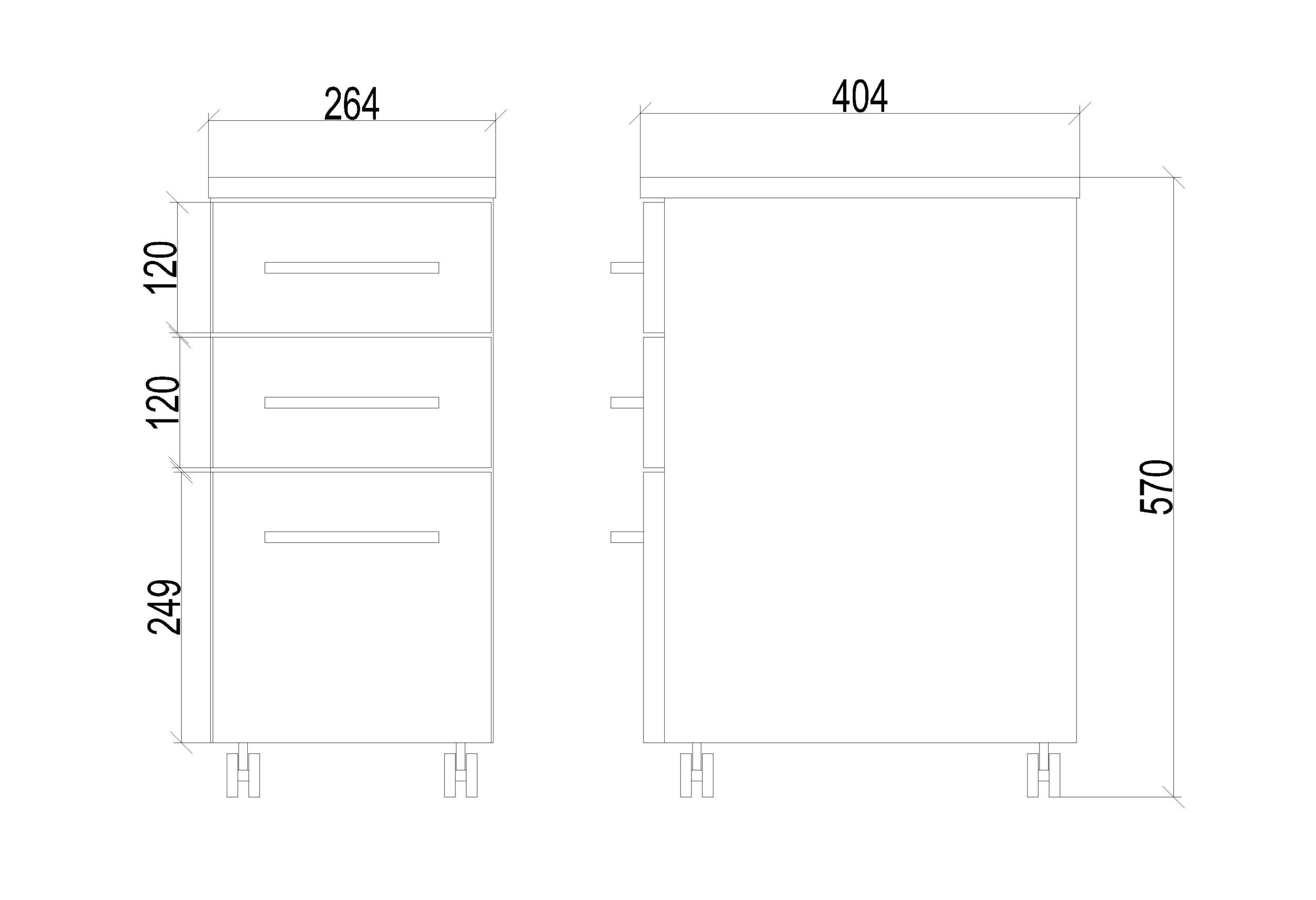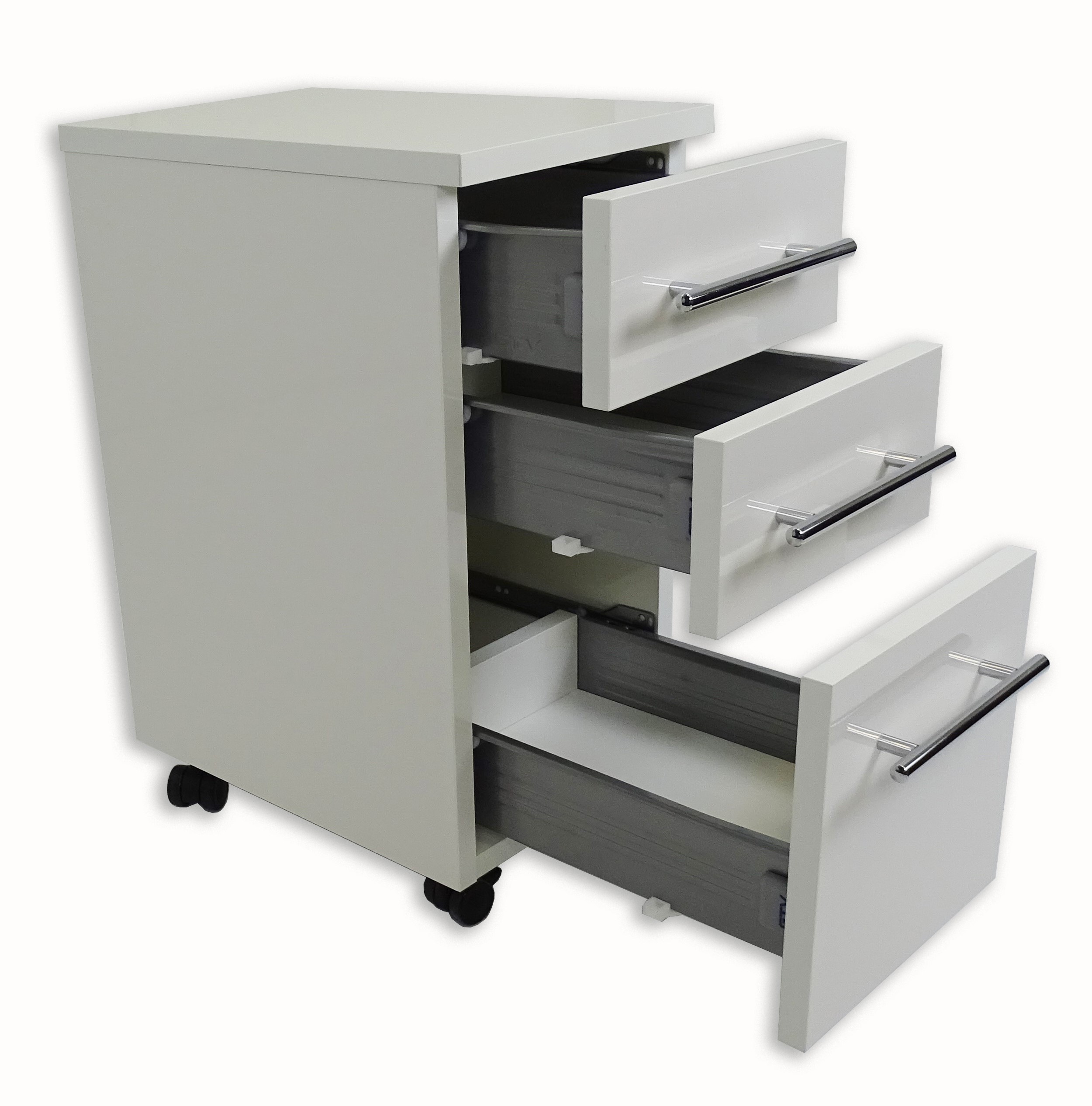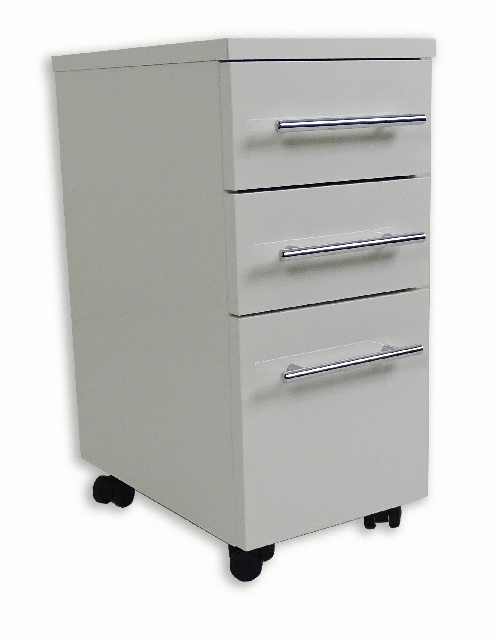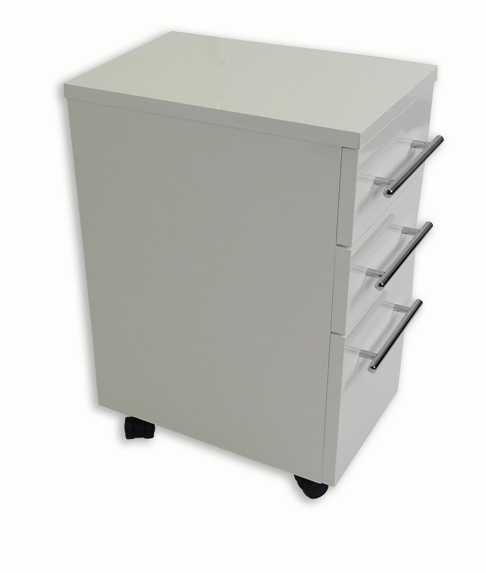 Cassettiera in melaminico bianco con chiusura ammortizzata. Dotata di 3 maniglie cromate.