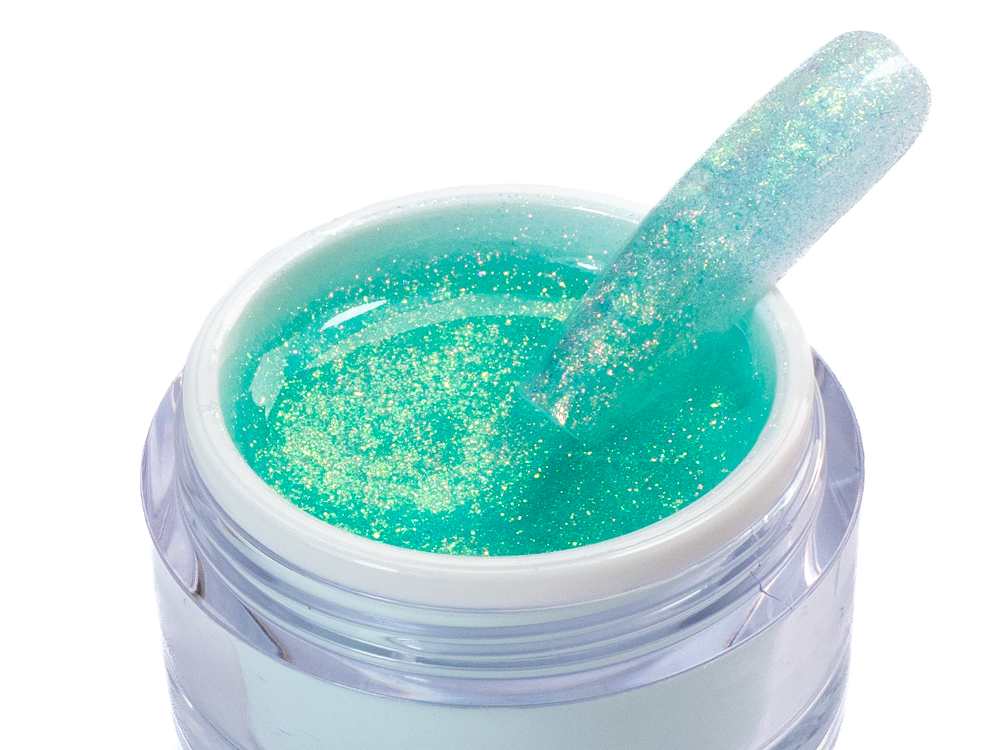Le particelle iridescenti creano giochi di luce dinamici con riflessi verde, oro e azzurro, rendendo questo gel ideale per manicure scenografiche, stagionali o da evento.
