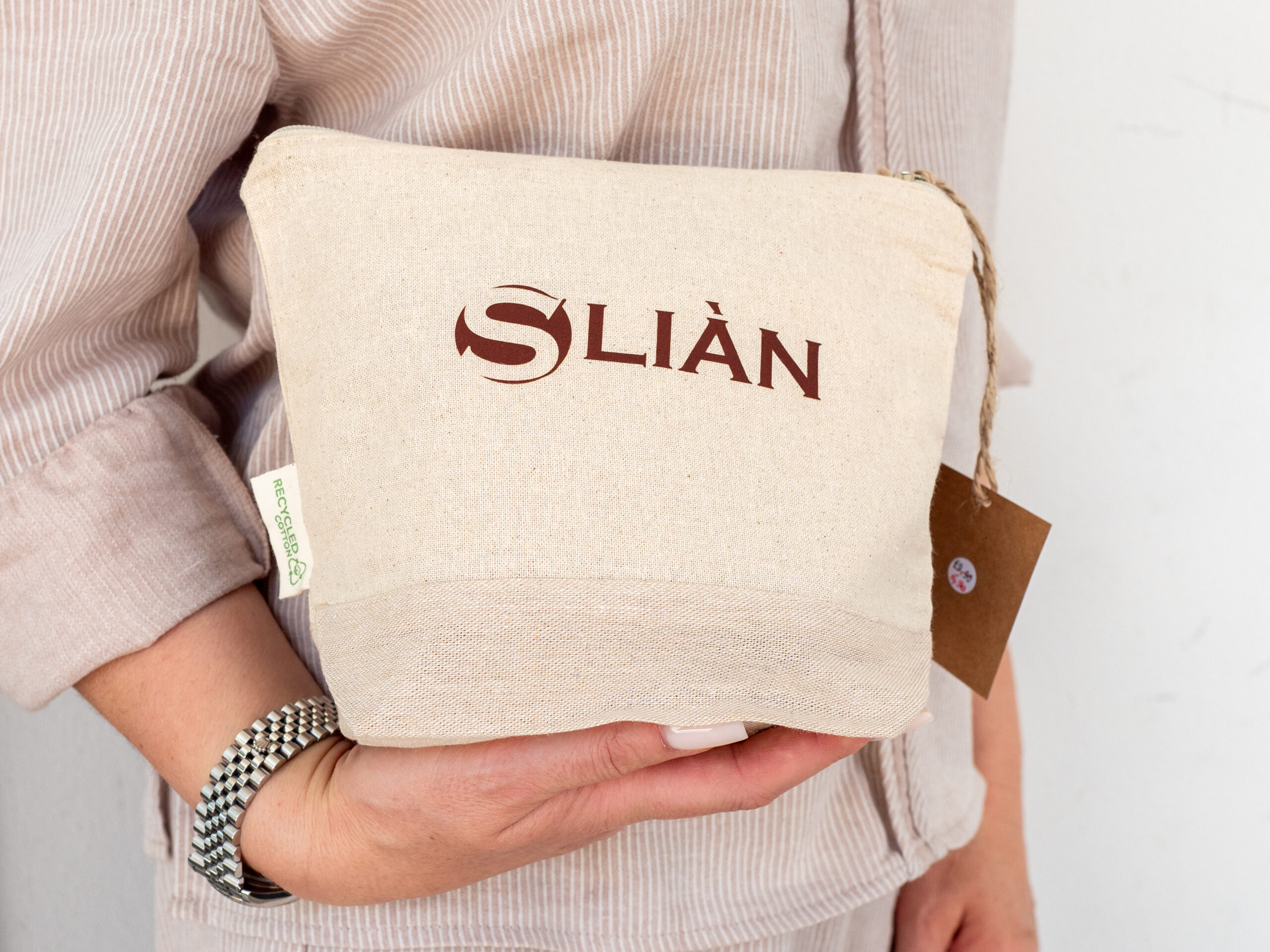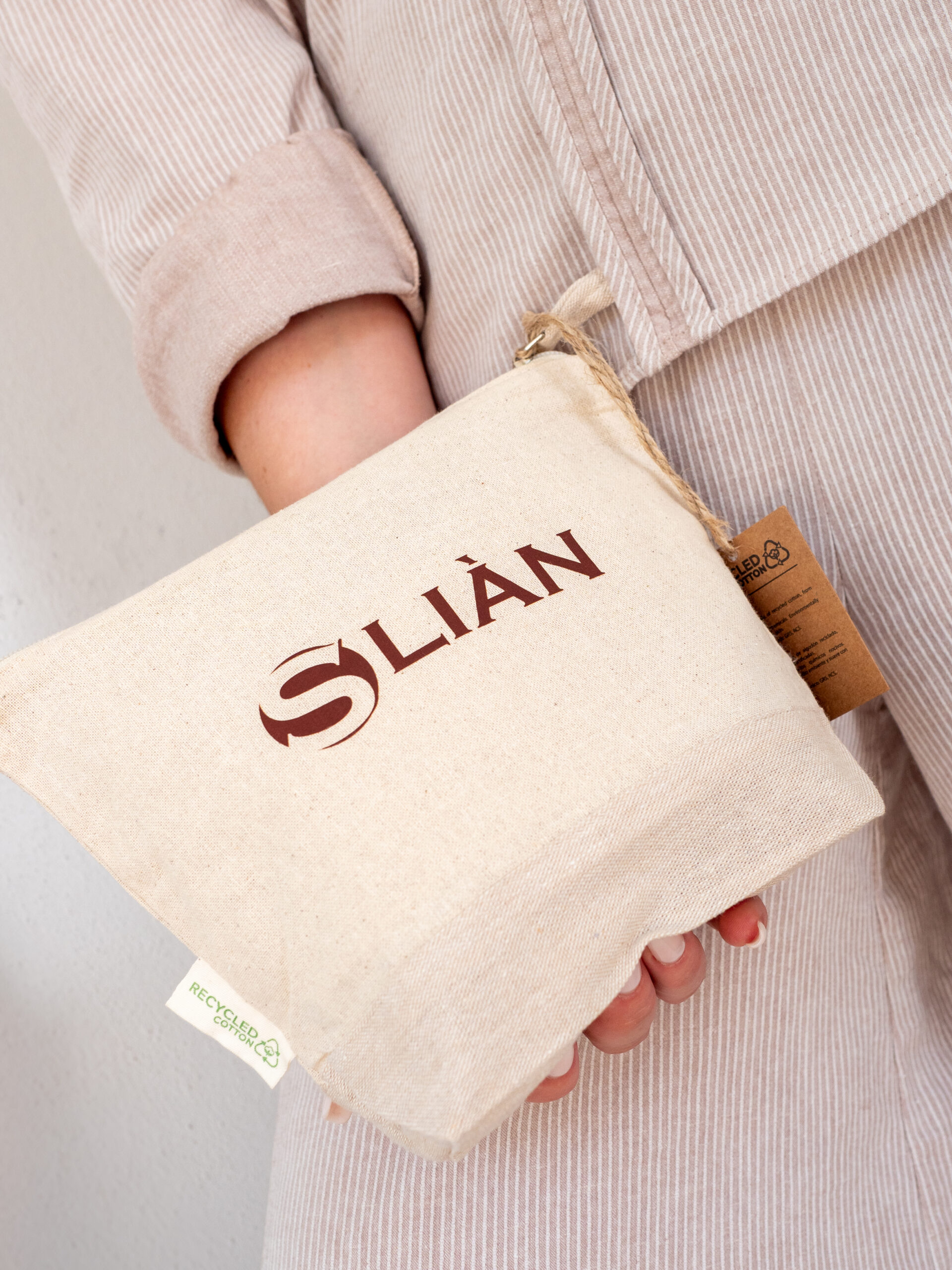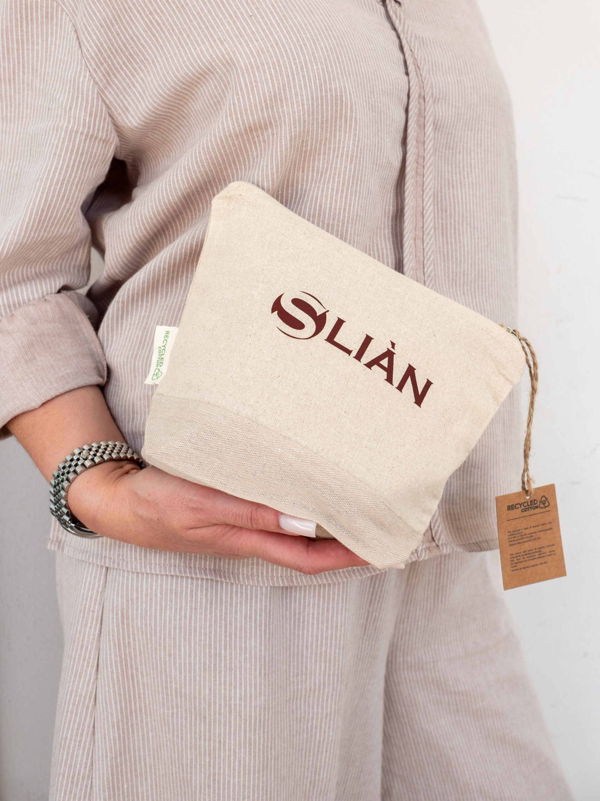 Il tessuto è morbido, naturale al tatto e privo di sostanze chimiche nocive, garantendo sicurezza anche a contatto diretto con la pelle. Il colore neutro, in tonalità sabbia, è impreziosito dal logo Sliàn stampato in marrone scuro, che dona un tocco distintivo e raffinato. La chiusura con zip assicura la protezione del contenuto, mentre il pratico laccetto in corda naturale consente una presa comoda o l’aggancio alla borsa da spiaggia.