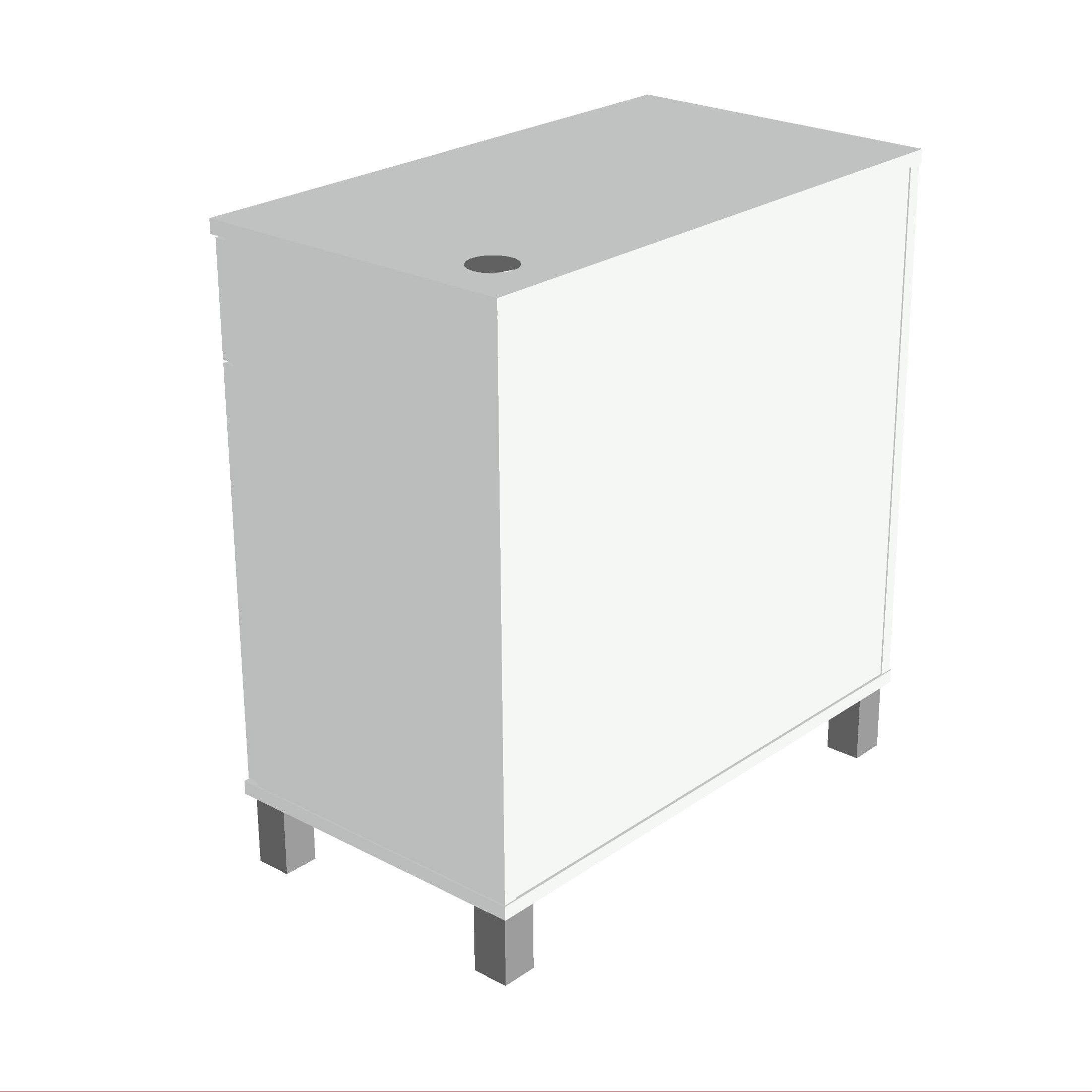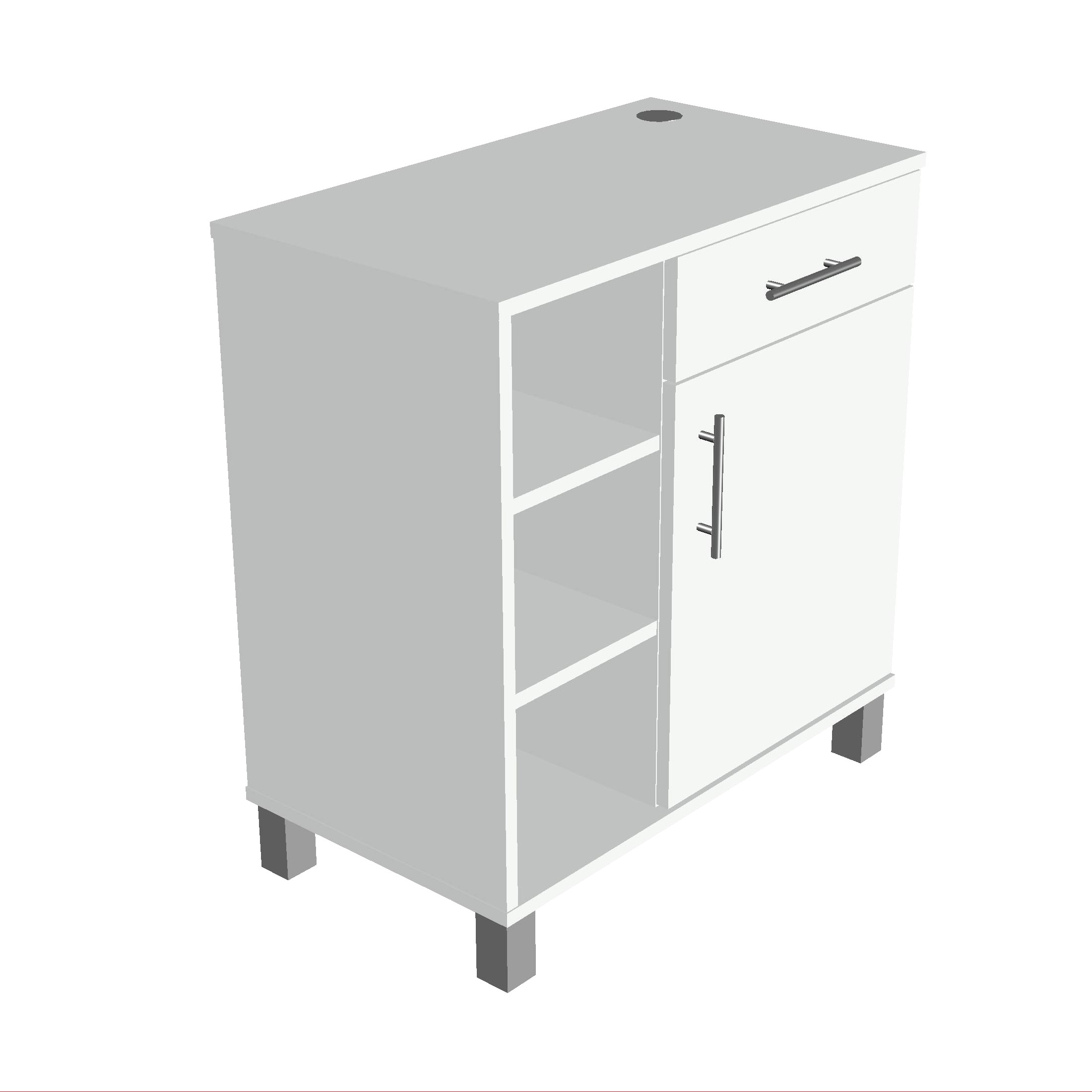 Il mobile è composto da due parti, una con ripiani espositivi l’altra con un cassetto con chiusura rallentata e un sportello con cerniera.