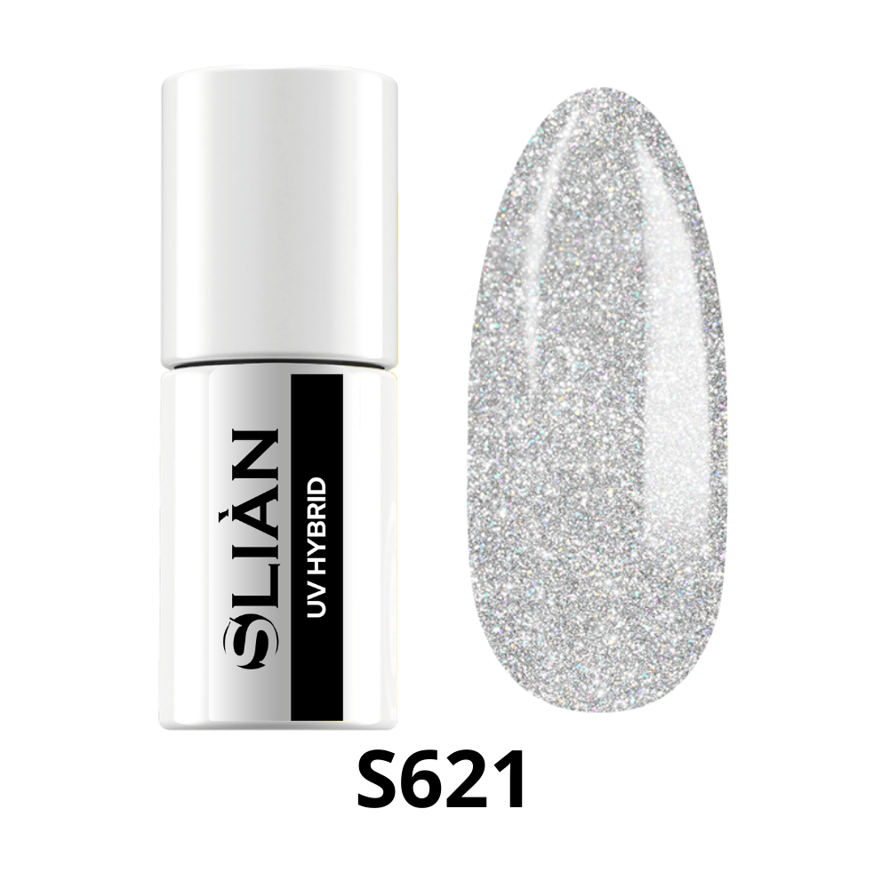 Il Gel color S621 argento brillante è uno smalto semipermanente ad alta concentrazione di glitter, caratterizzato da una base fredda e luminosa che riflette la luce con effetto scintillante.
