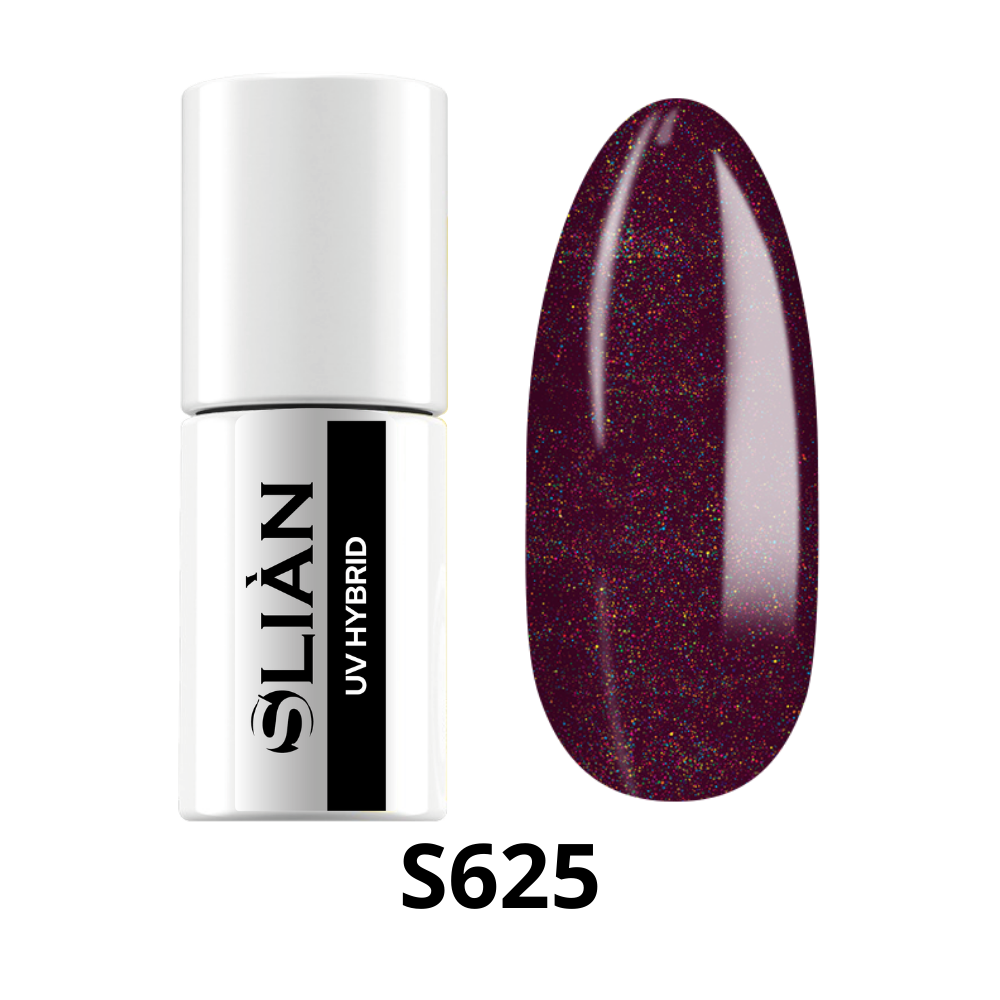 Il Gel color S625 rosso borgogna galaxy è uno smalto semipermanente con base scura rosso-viola arricchita da microglitter multicolore che creano un elegante effetto luminoso e profondo.