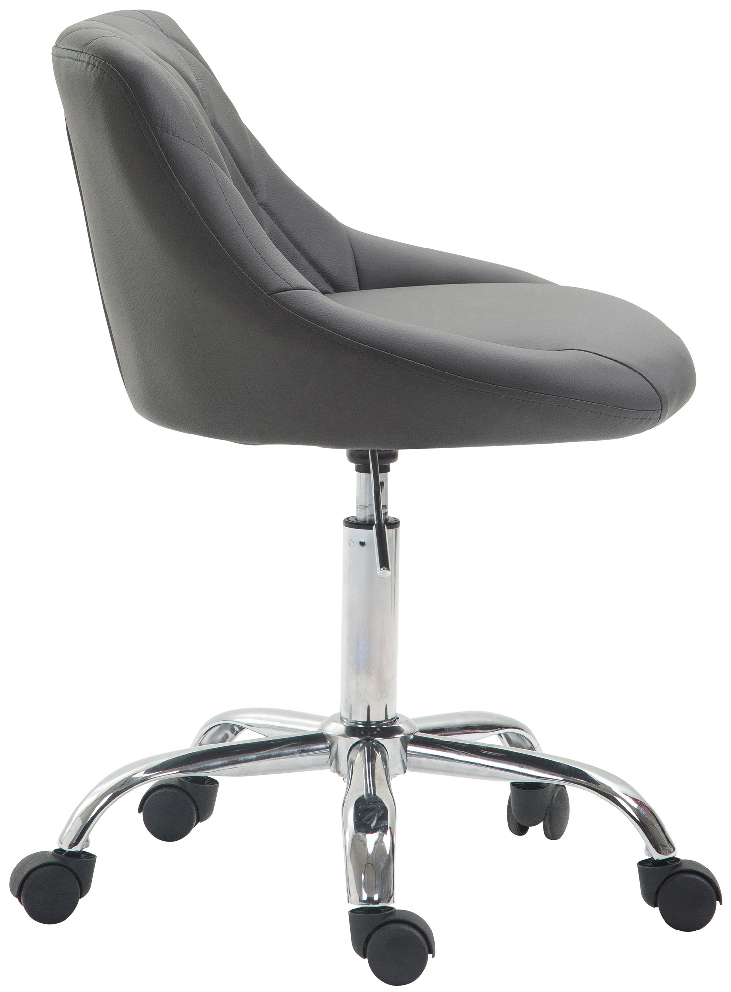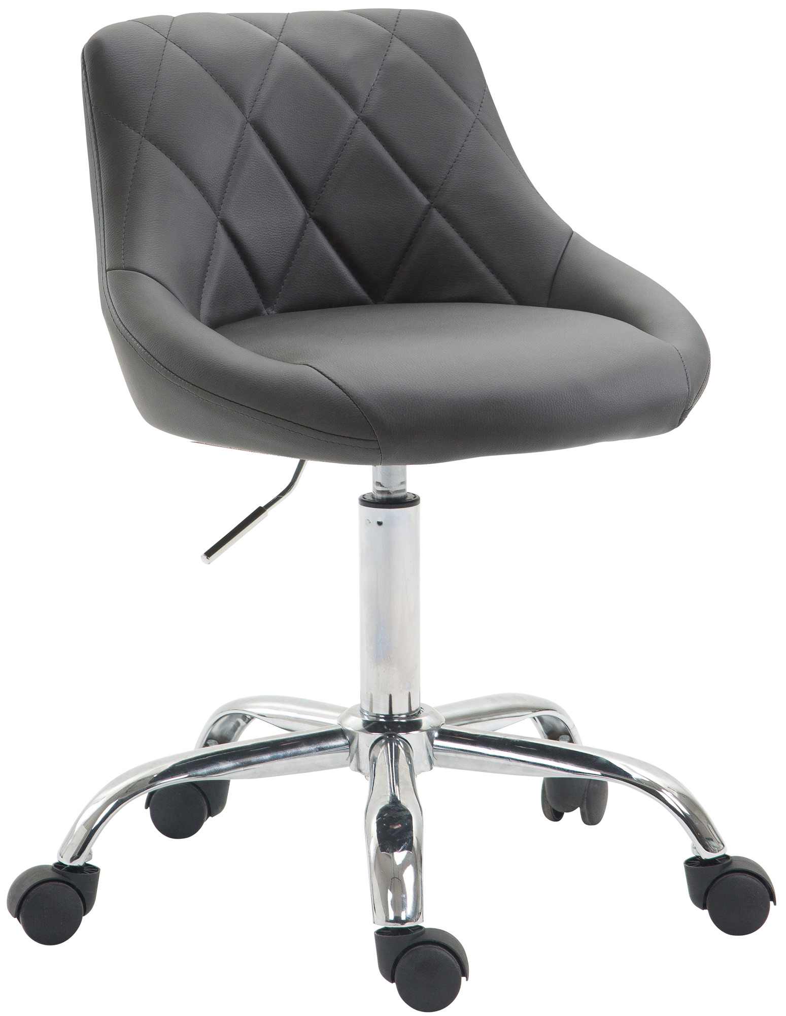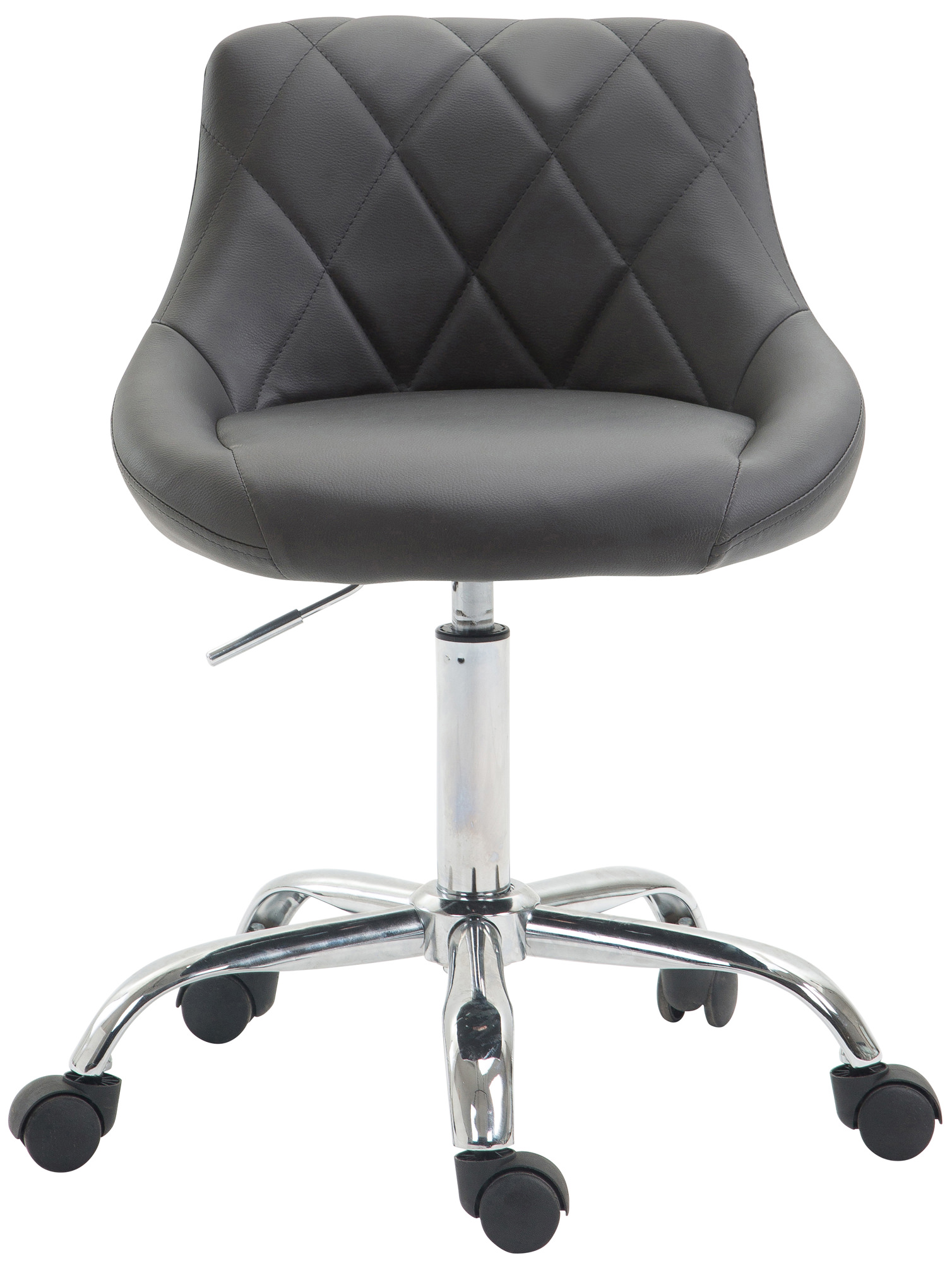 La sedia Lazio è leader in fatto di comfort. La fodera è realizzata in pregiata ecopelle facilmente pulibile e lo schienale imbottito e decorato con una trama a rombi. Il solido telaio in metallo cromo è composto di un meccanismo a gas per la regolazione dell’altezza tramite comoda leva posta sotto il sellino.