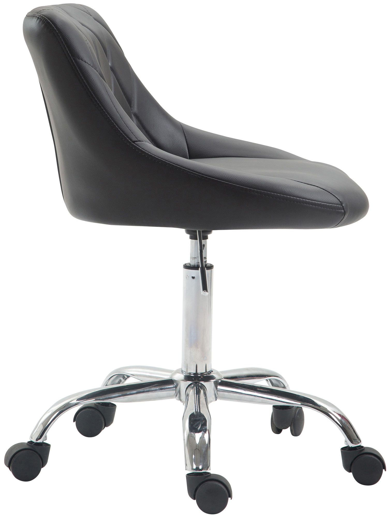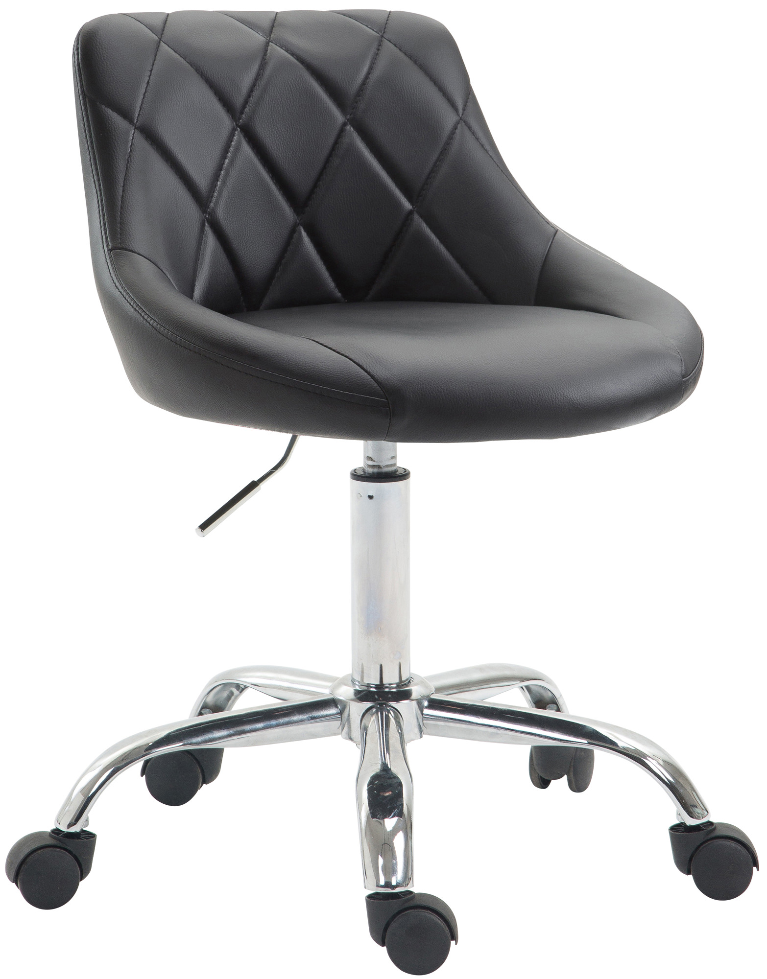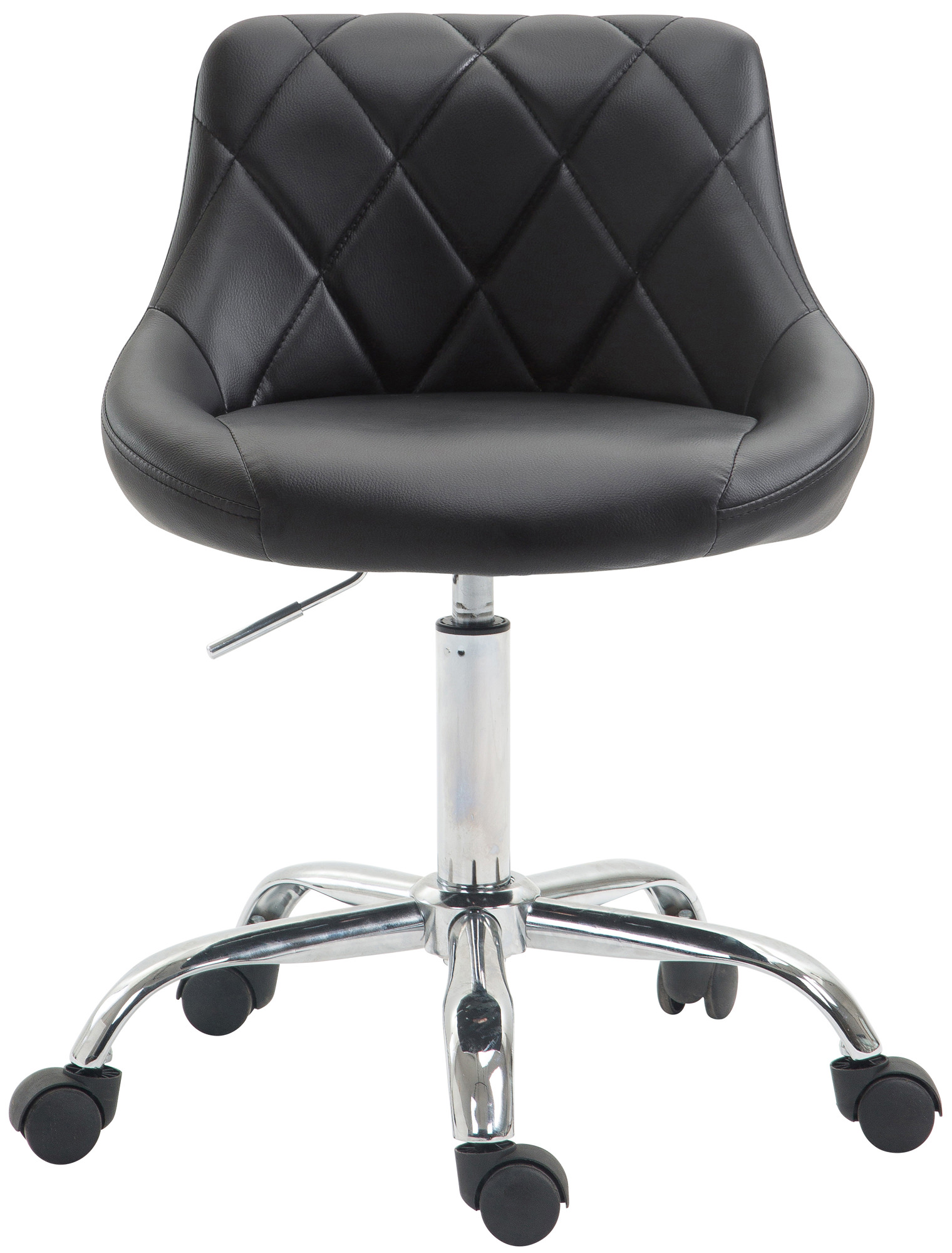 La sedia Lazio è leader in fatto di comfort. La fodera è realizzata in pregiata ecopelle facilmente pulibile e lo schienale imbottito e decorato con una trama a rombi. Il solido telaio in metallo cromo è composto di un meccanismo a gas per la regolazione dell’altezza tramite comoda leva posta sotto il sellino.