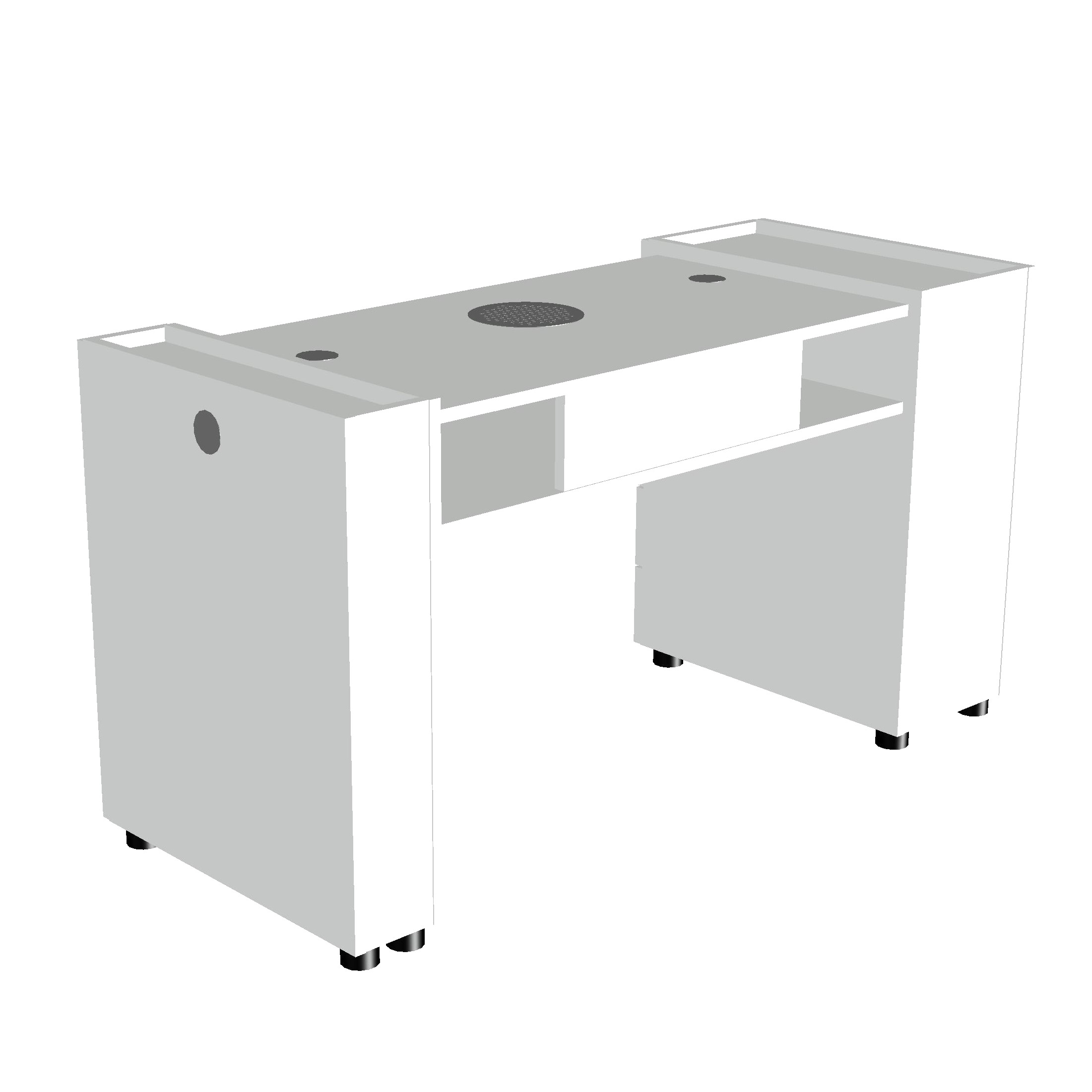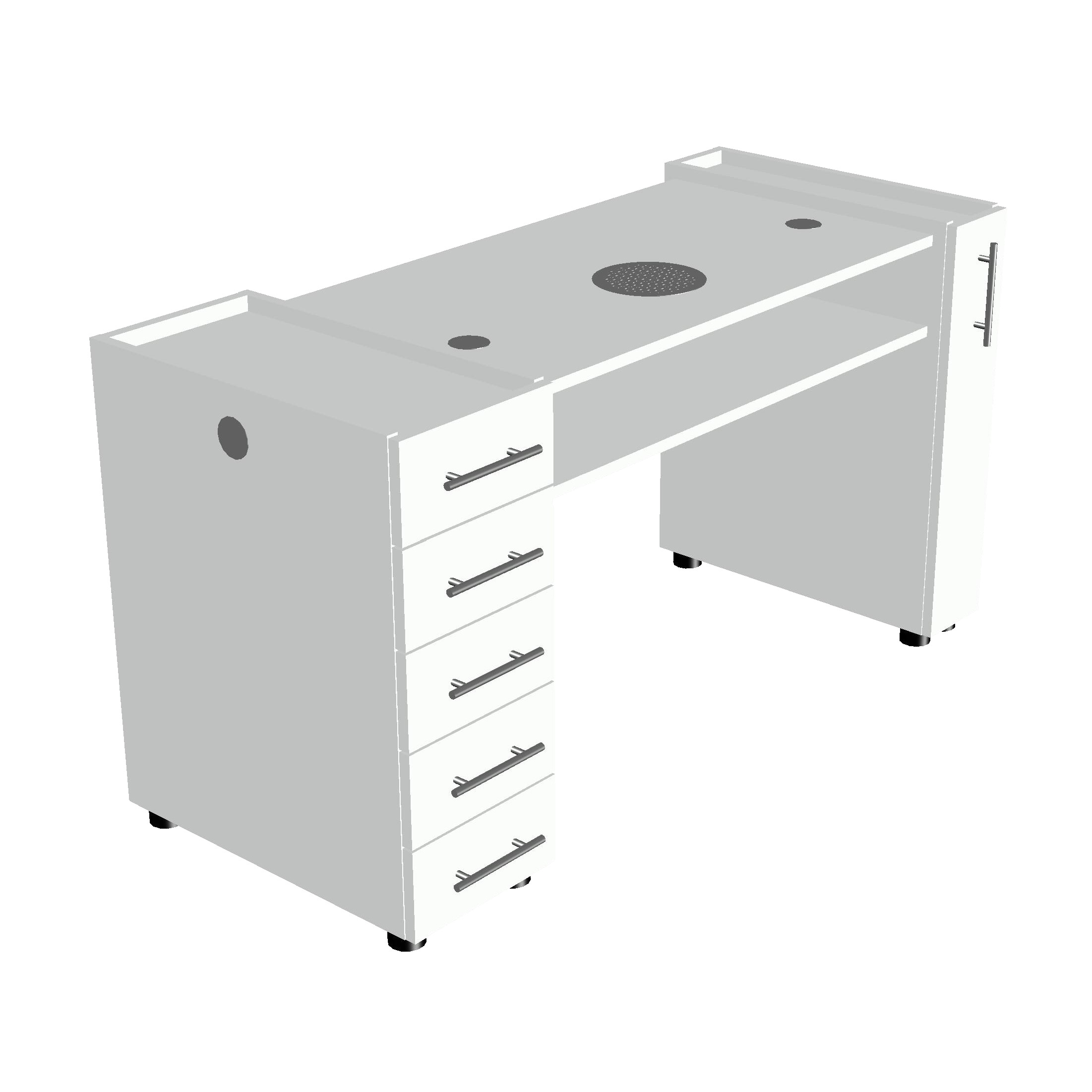 La configurazione permette di utilizzare comodamente cuscino poggia mani, lampada da tavolo e lampade UV/LED, posizionabili sia sul piano di lavoro sia sul ripiano inferiore dedicato.
