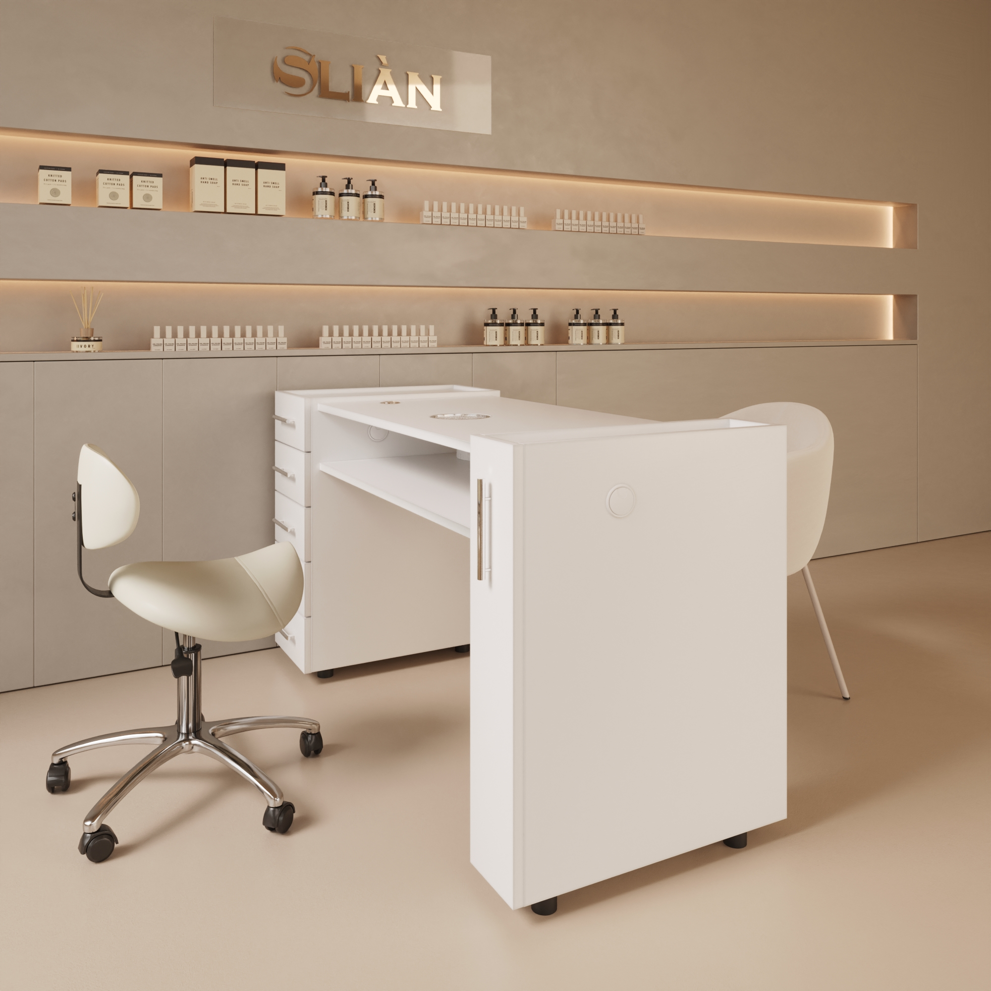 Postazione ergonomica progettata per garantire comfort all’operatore e alla cliente durante tutto il servizio.