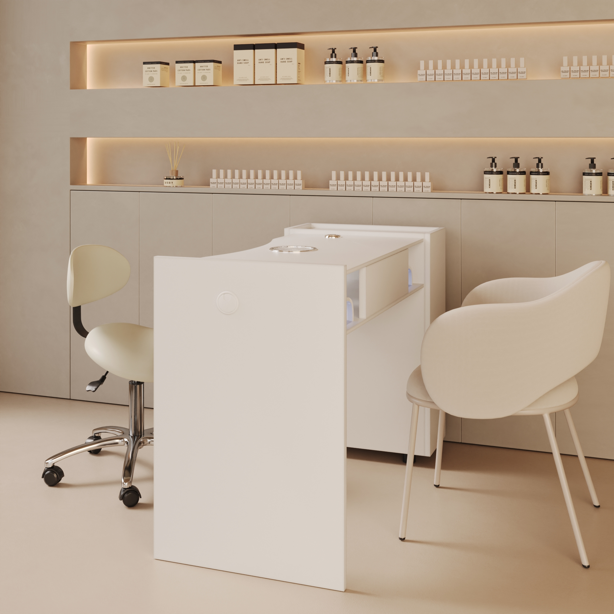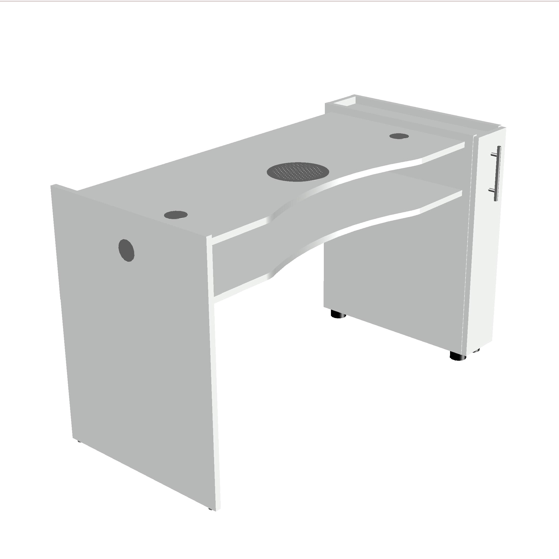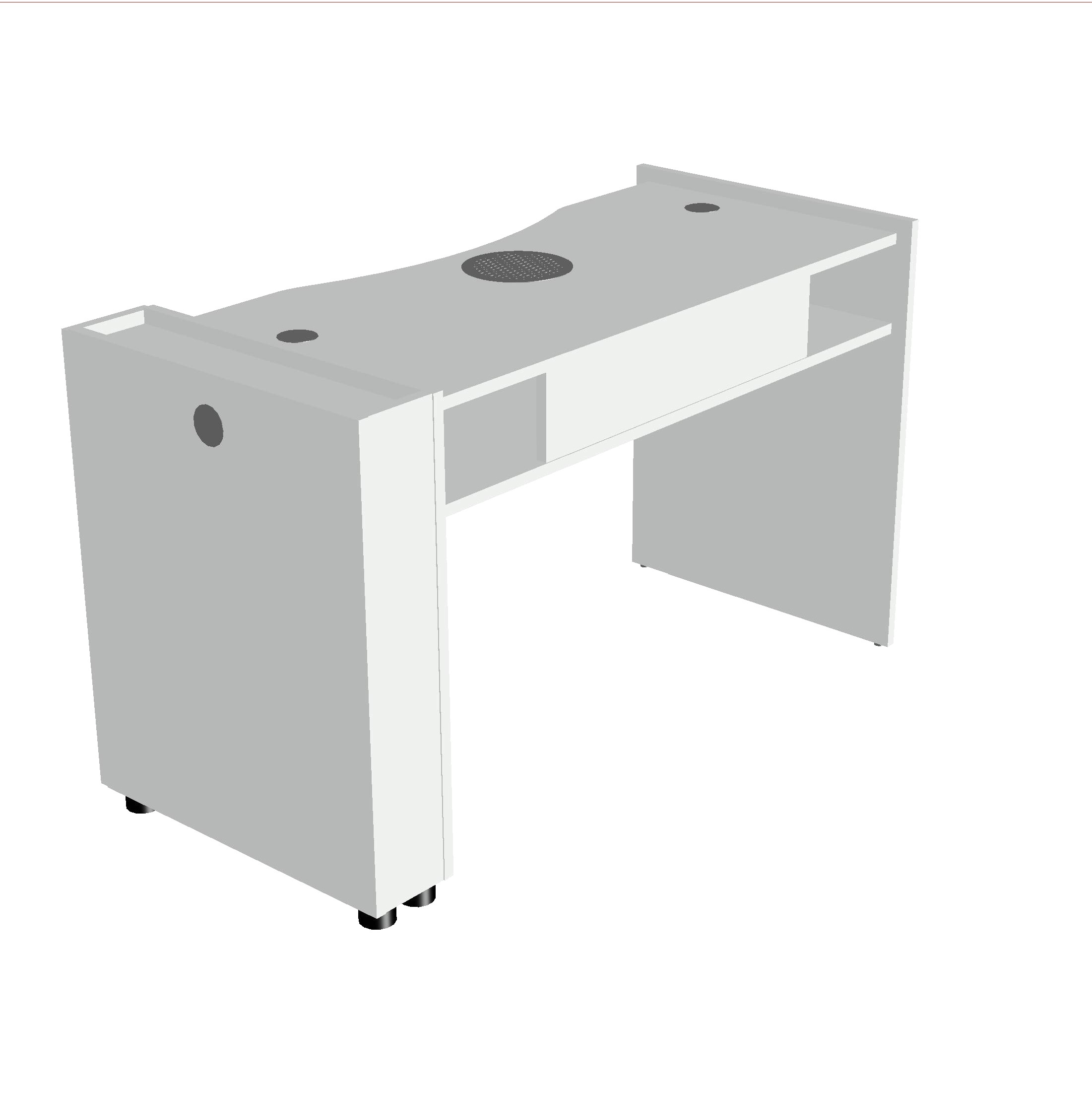 La configurazione consente di lavorare comodamente con cuscino poggia mani, lampada da tavolo e lampade UV/LED, posizionabili sia sul piano di lavoro sia sul ripiano inferiore dedicato.