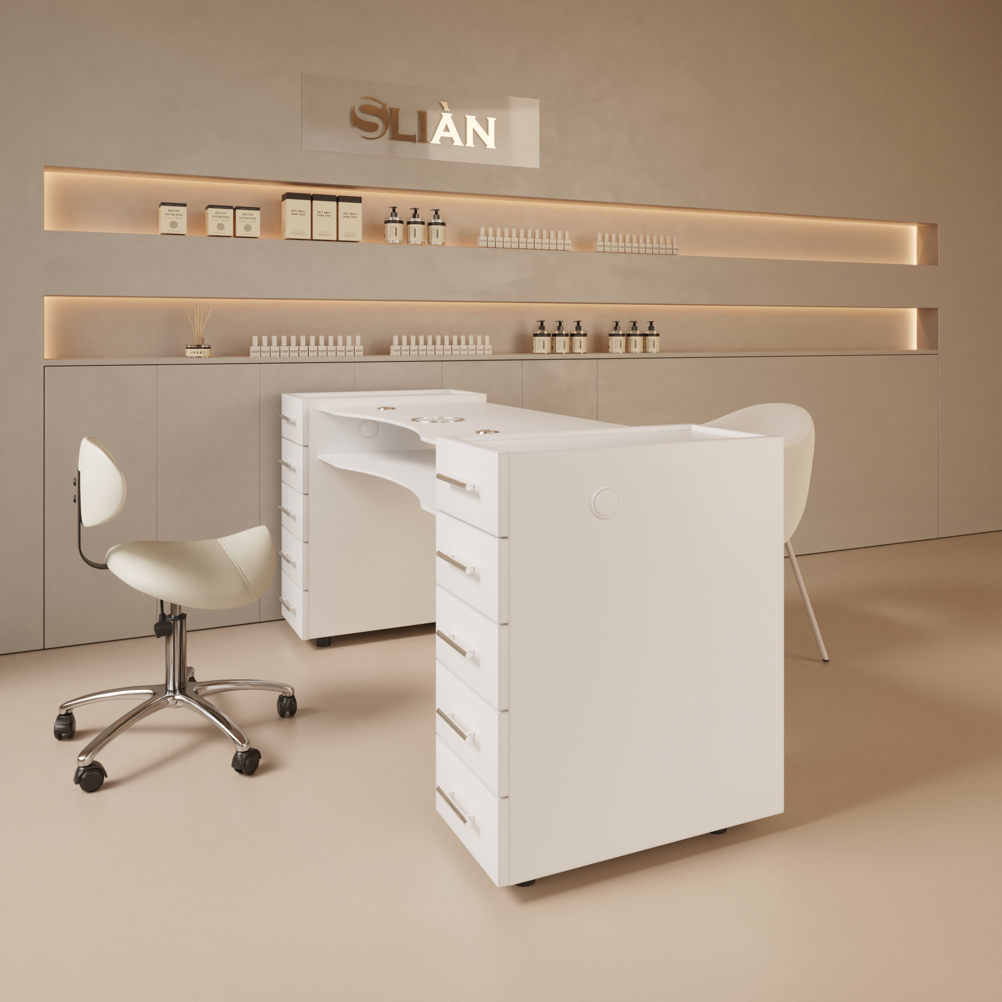 La struttura consente di utilizzare comodamente cuscino poggia mani, lampada da tavolo e lampade UV/LED, posizionabili sia sul piano di lavoro sia sul ripiano inferiore dedicato.