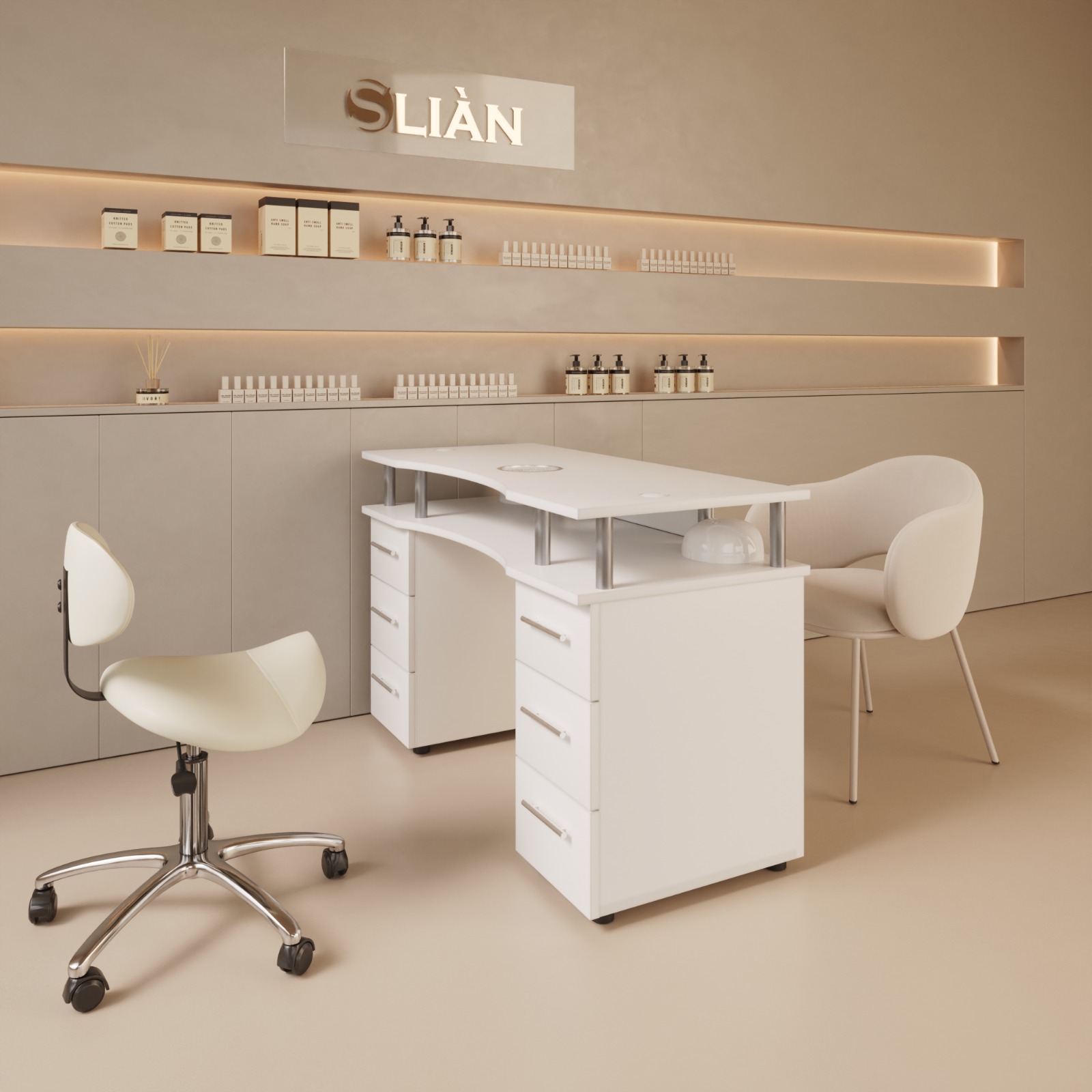 Il Tavolo Treviso 120 cm è una postazione manicure professionale dal design ergonomico e dalla struttura solida, progettata per offrire massima funzionalità e organizzazione all’interno del salone.