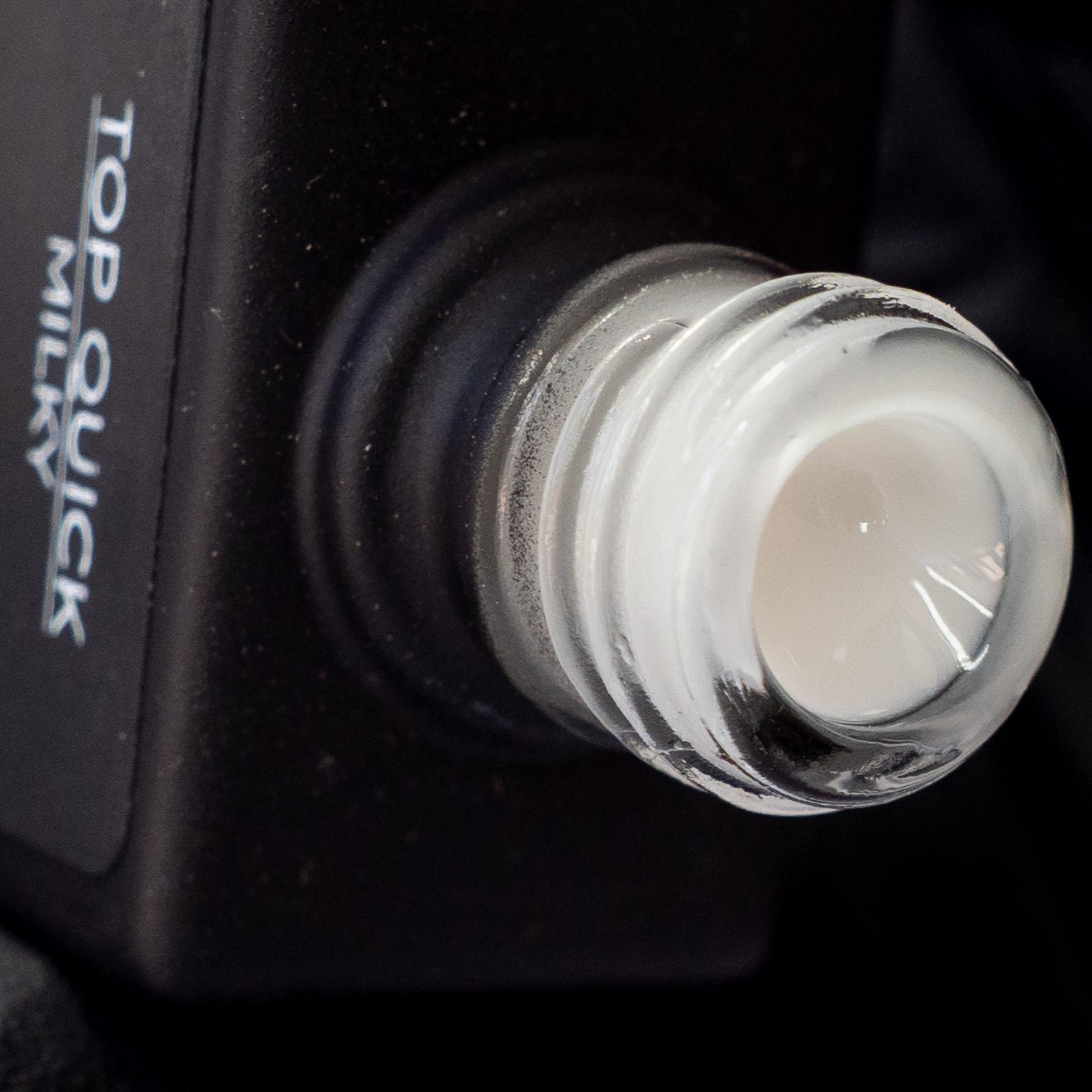 Applicare uno strato sottile di Top Quick Milky su tutta l’unghia.