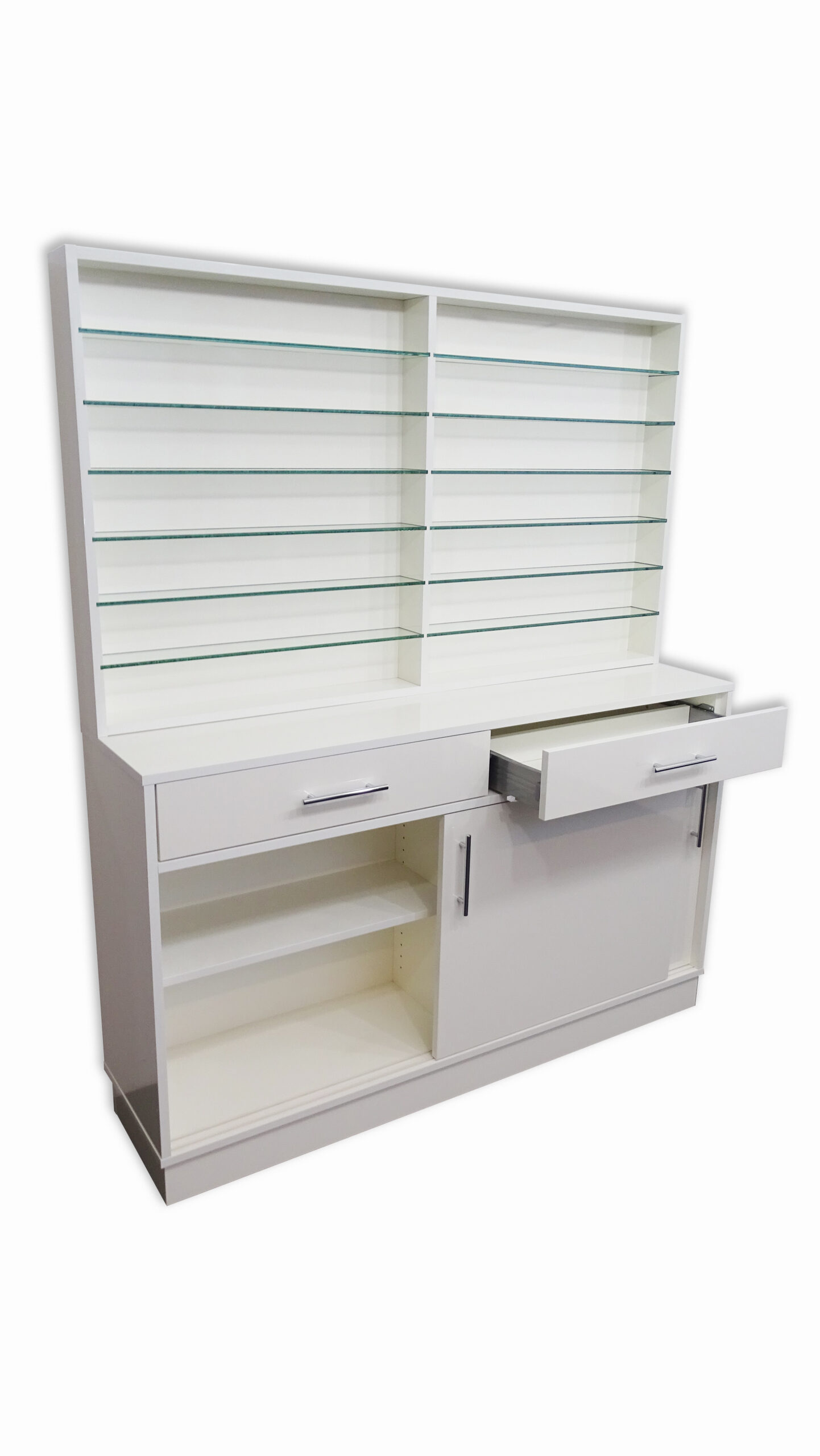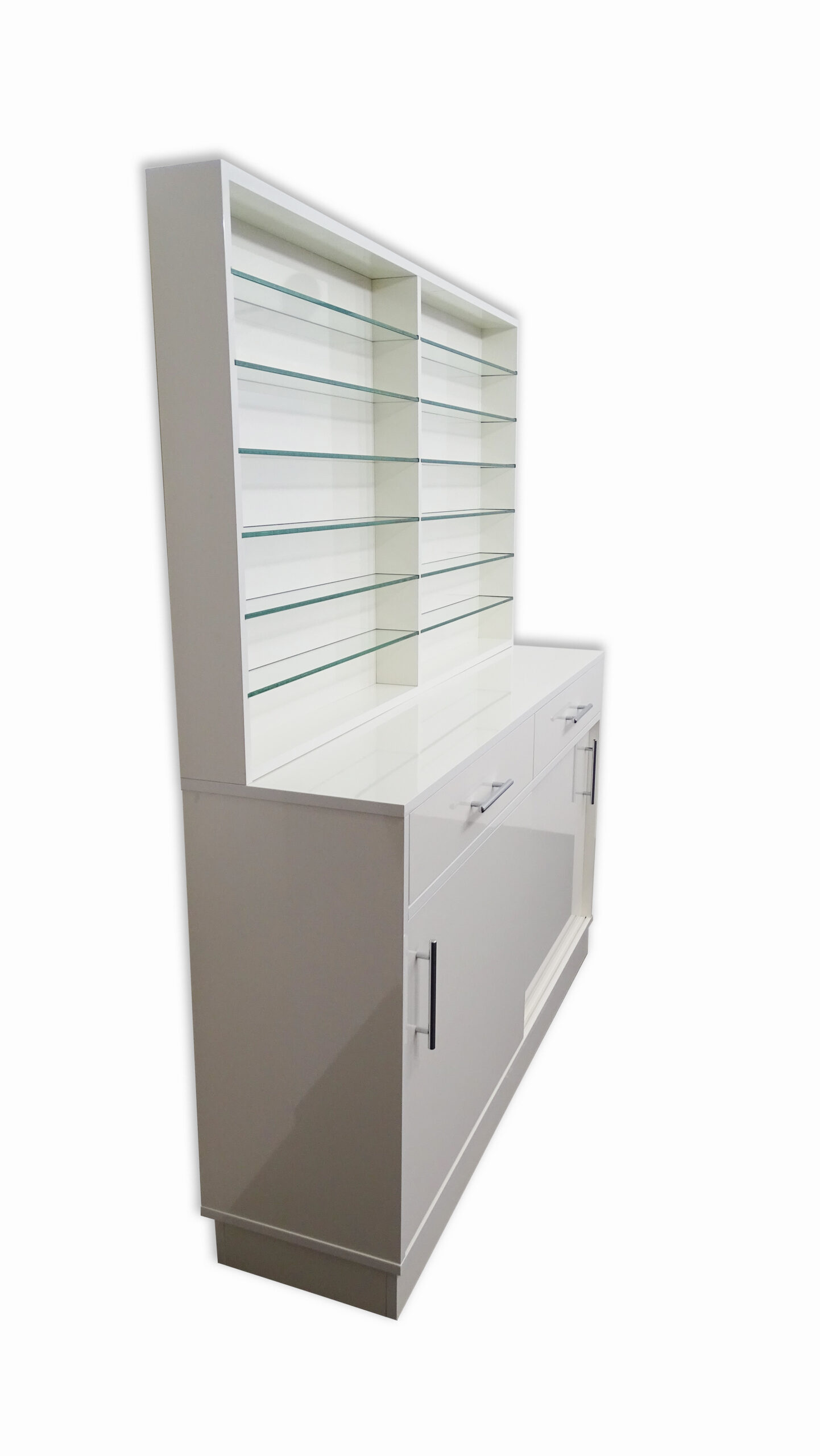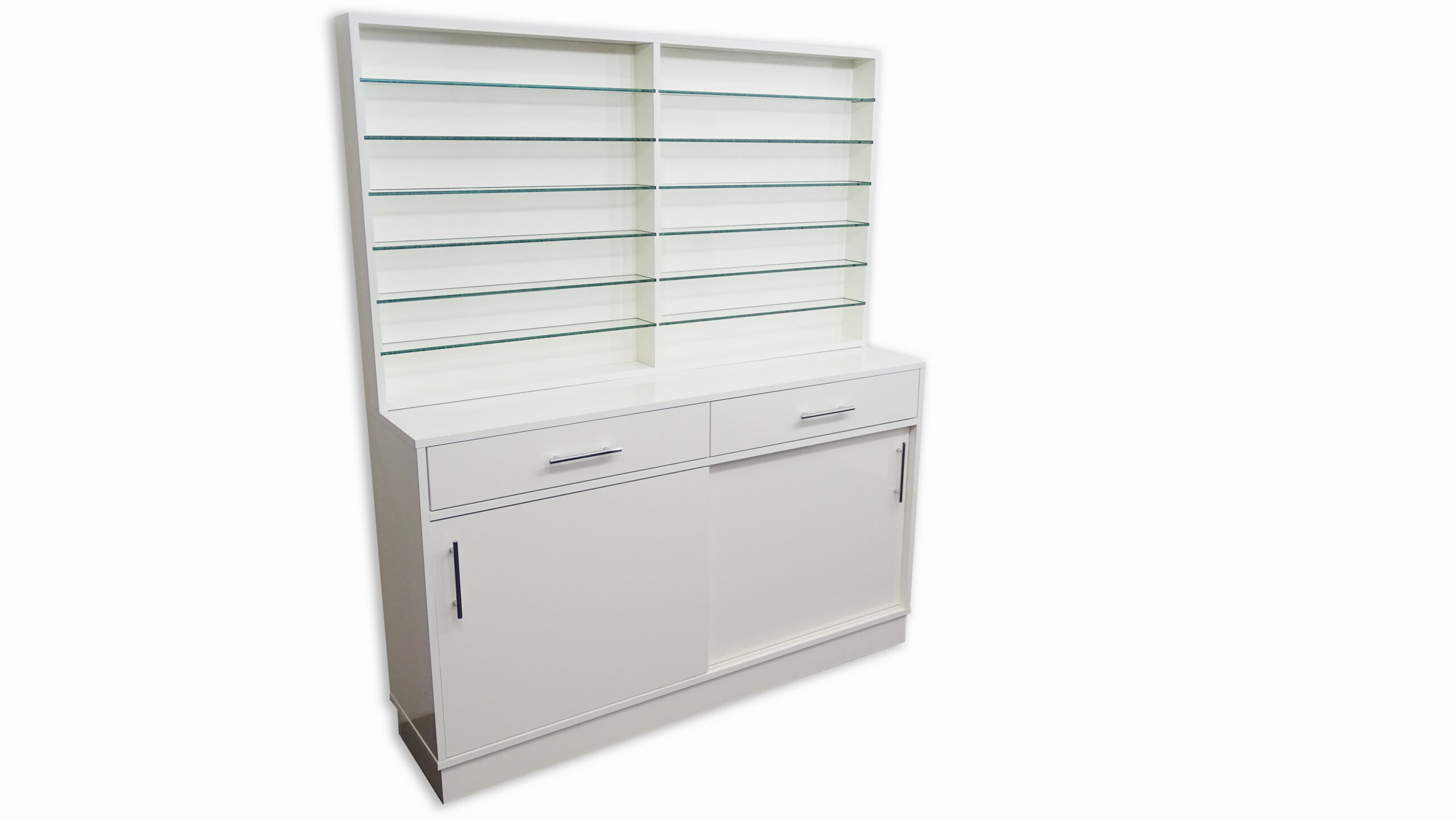 Parte alta con mensole in vetro uso vetrina, parte bassa con sportelli scorrevoli per uso contenitore.