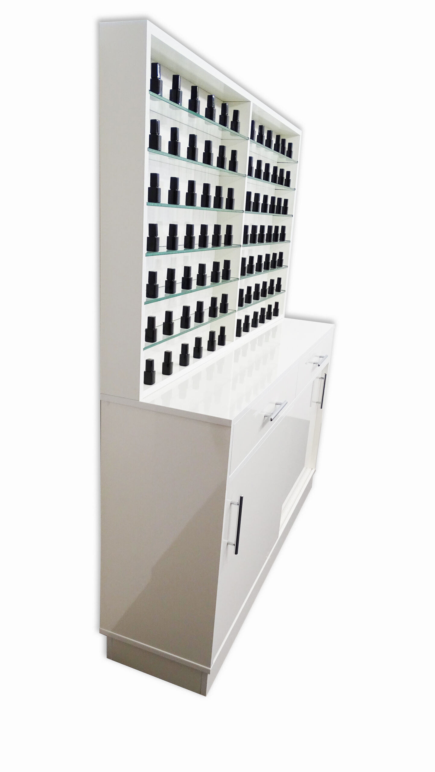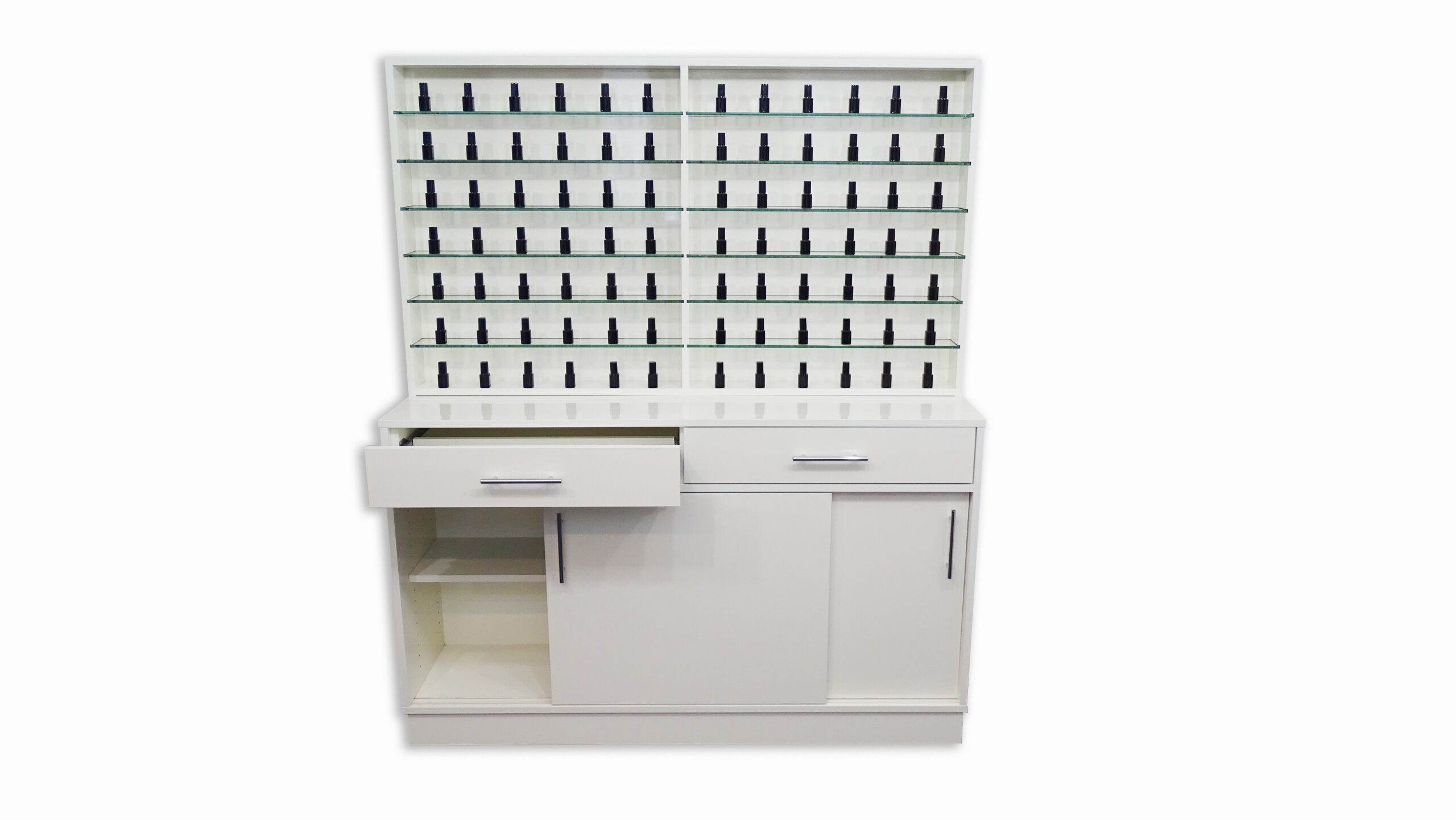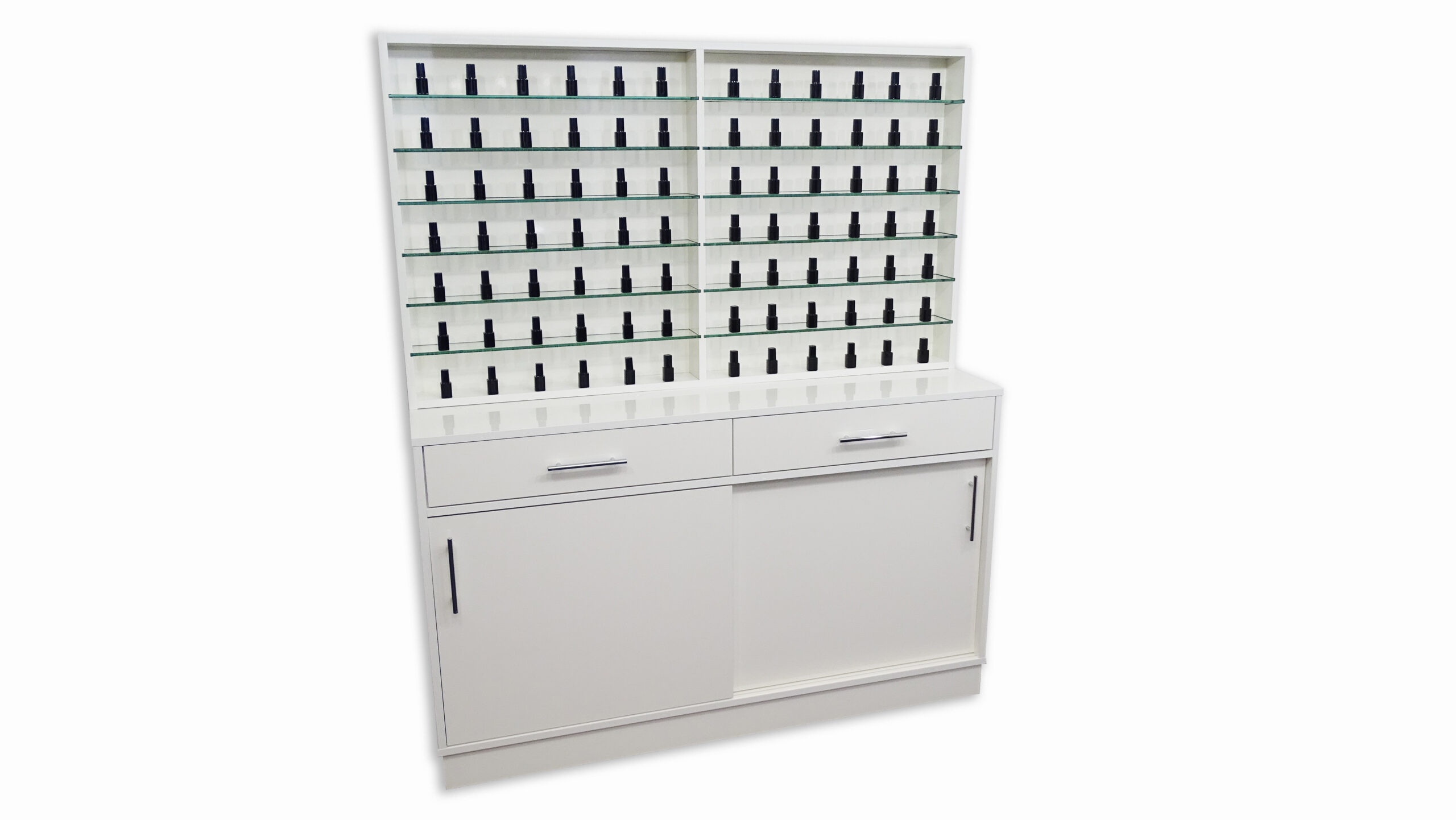 Parte alta con mensole in vetro uso vetrina, parte bassa con sportelli scorrevoli per uso contenitore.